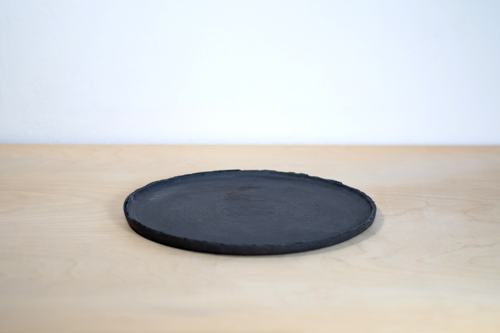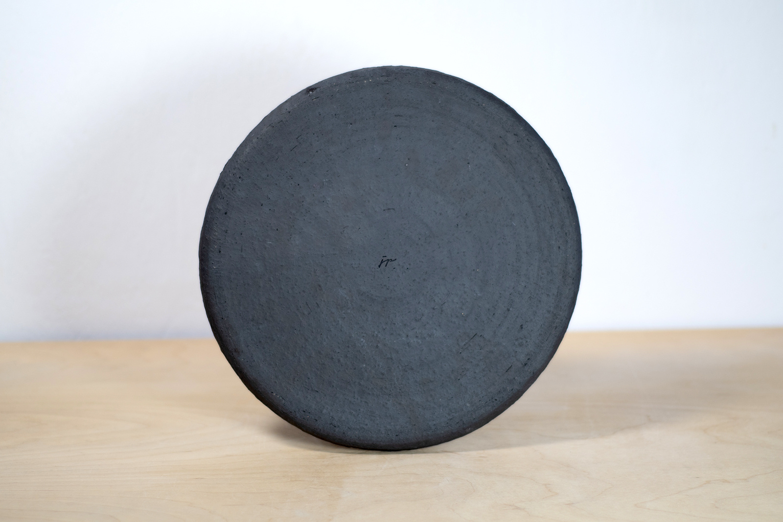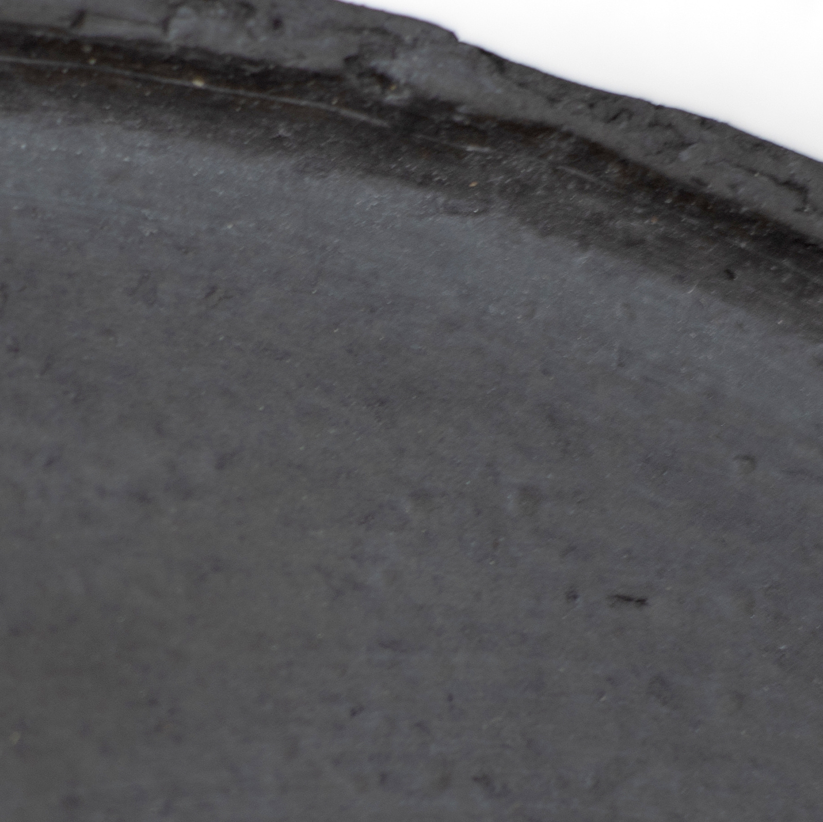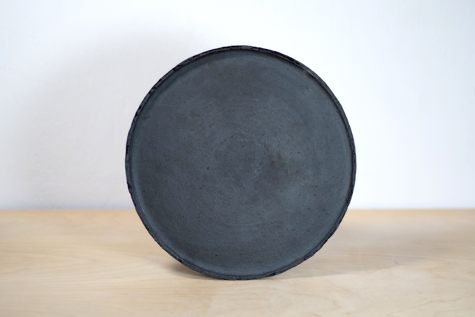 - Średniej wielkości talerz o prostej formie. W całości wykonany ręcznie z czarnej, chropowatej gliny. Nieszkliwiony. Dekorowany artystycznie tylko poprzez pozostawienie struktury gliny na krawędziach talerza.