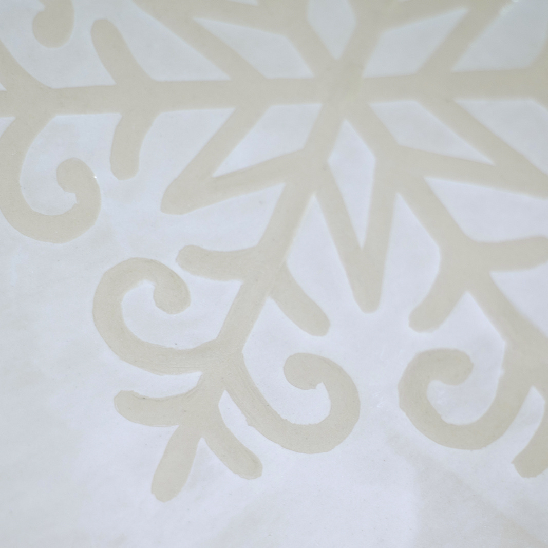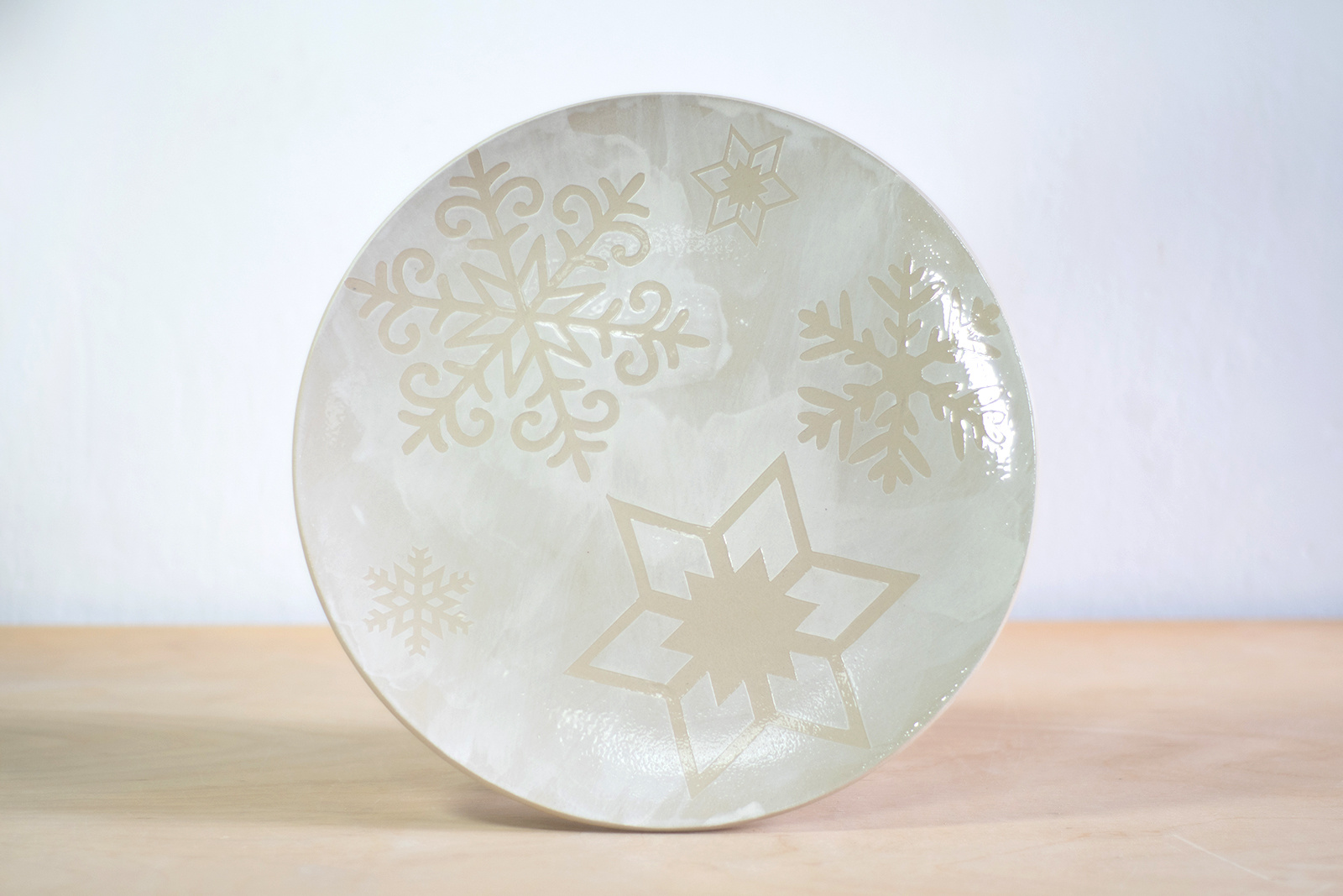 - Talerz o prostej formie. W całości wykonany ręcznie z gliny o kremowej barwie. Dekorowany tylko z frontowej strony białą angobą z płatkami śniegu. Szkliwiony transparentnym, błyszczącym szkliwem.