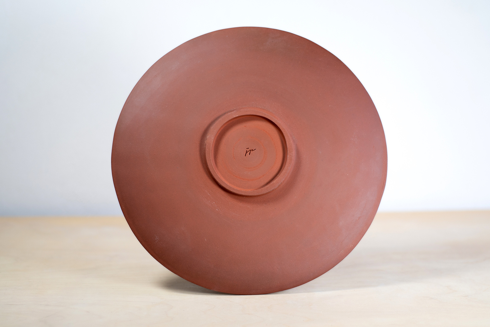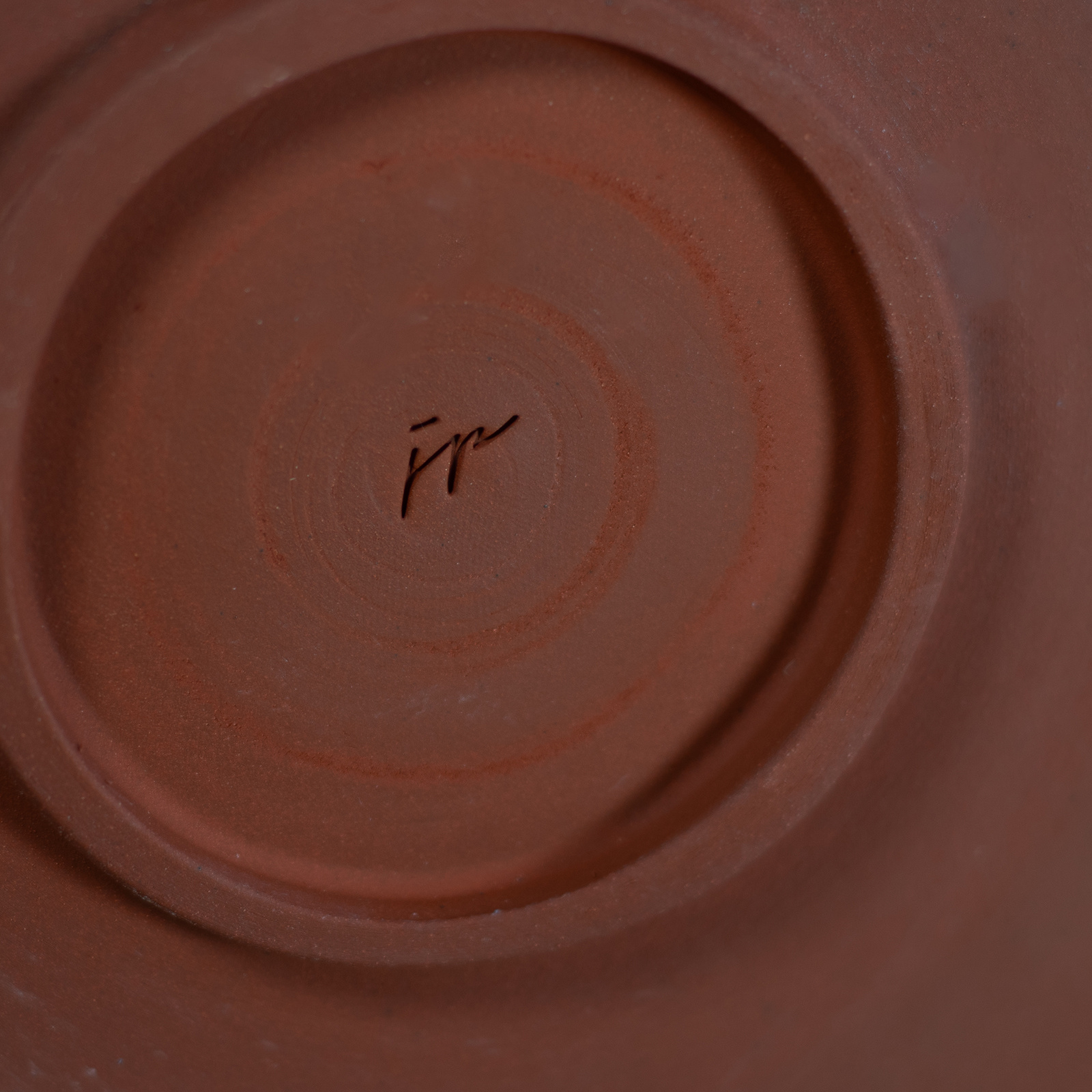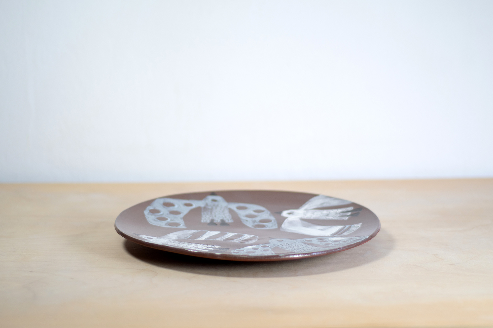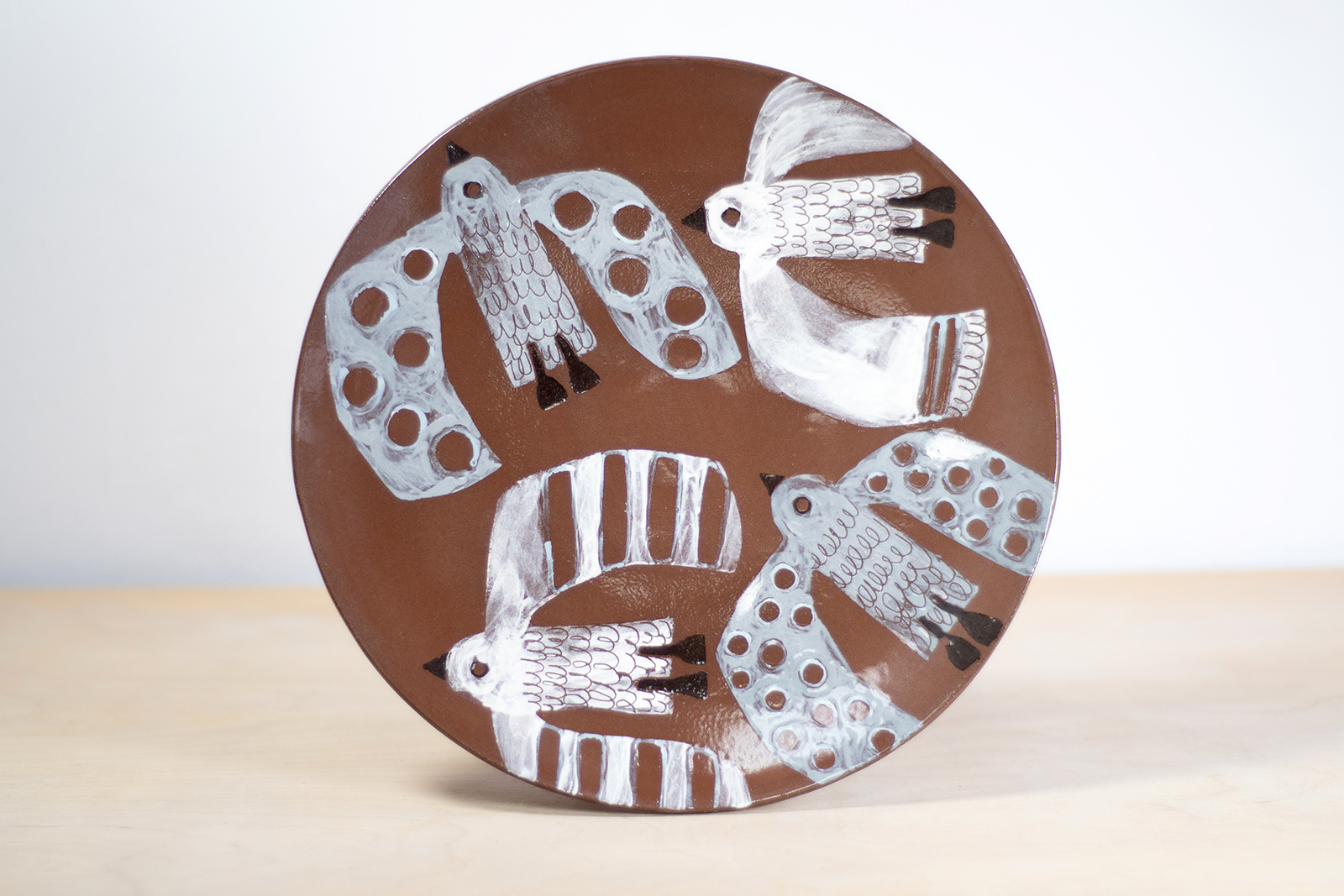 • Talerz o prostej formie. W całości wykonany ręcznie z gliny o ciemnobrązowej barwie. Dekorowany tylko z frontowej strony angobami w kształcie ptaków oraz transparentnym szkliwem.