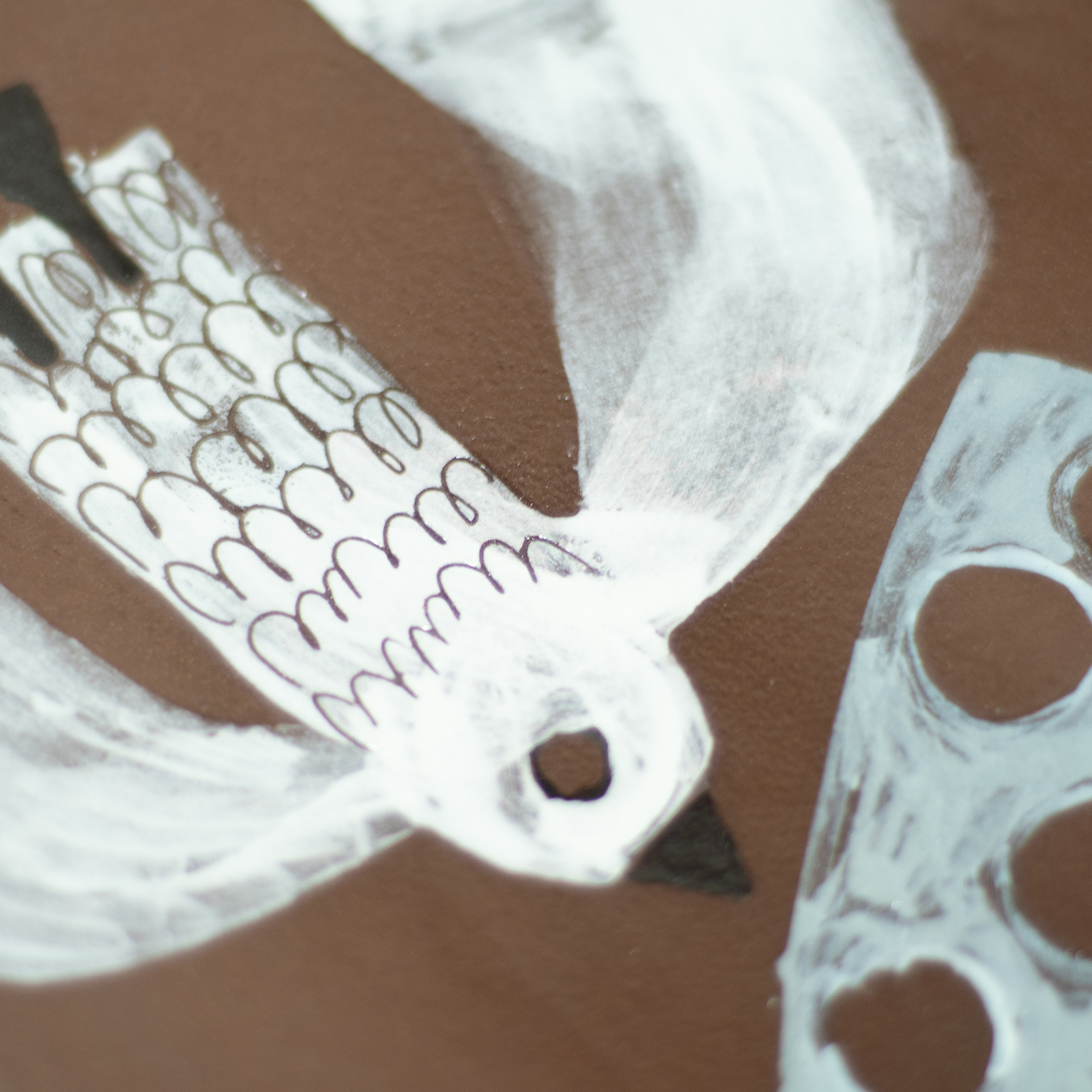 W całości wykonany ręcznie z gliny o ciemnobrązowej barwie. Dekorowany tylko z frontowej strony angobami w kształcie ptaków oraz transparentnym szkliwem. Stemplowany logo autorki.