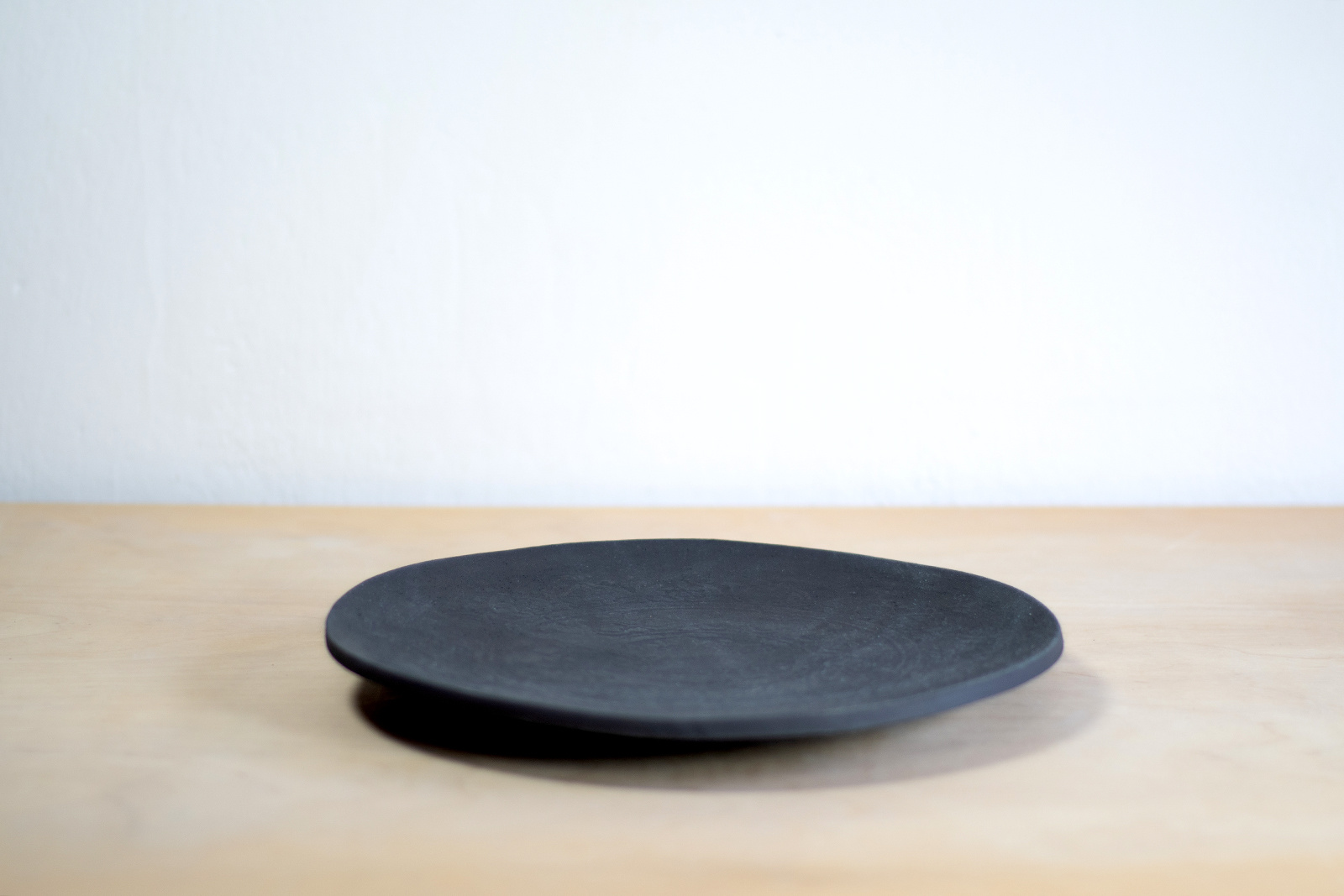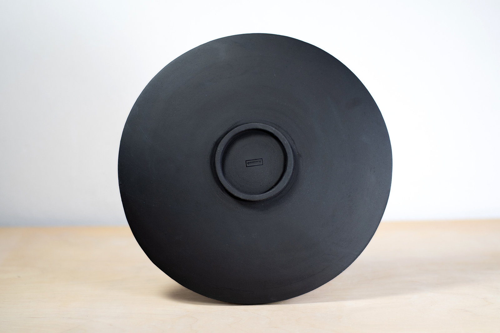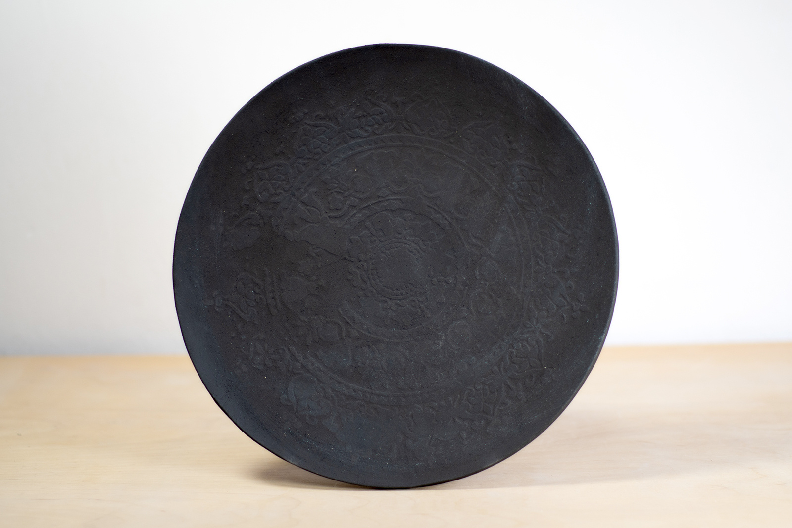 - Talerz o prostej formie. W całości wykonany ręcznie z gliny o czarnej barwie. Dekorowany tylko z frontowej strony reliefem w kształcie dużej mandali.