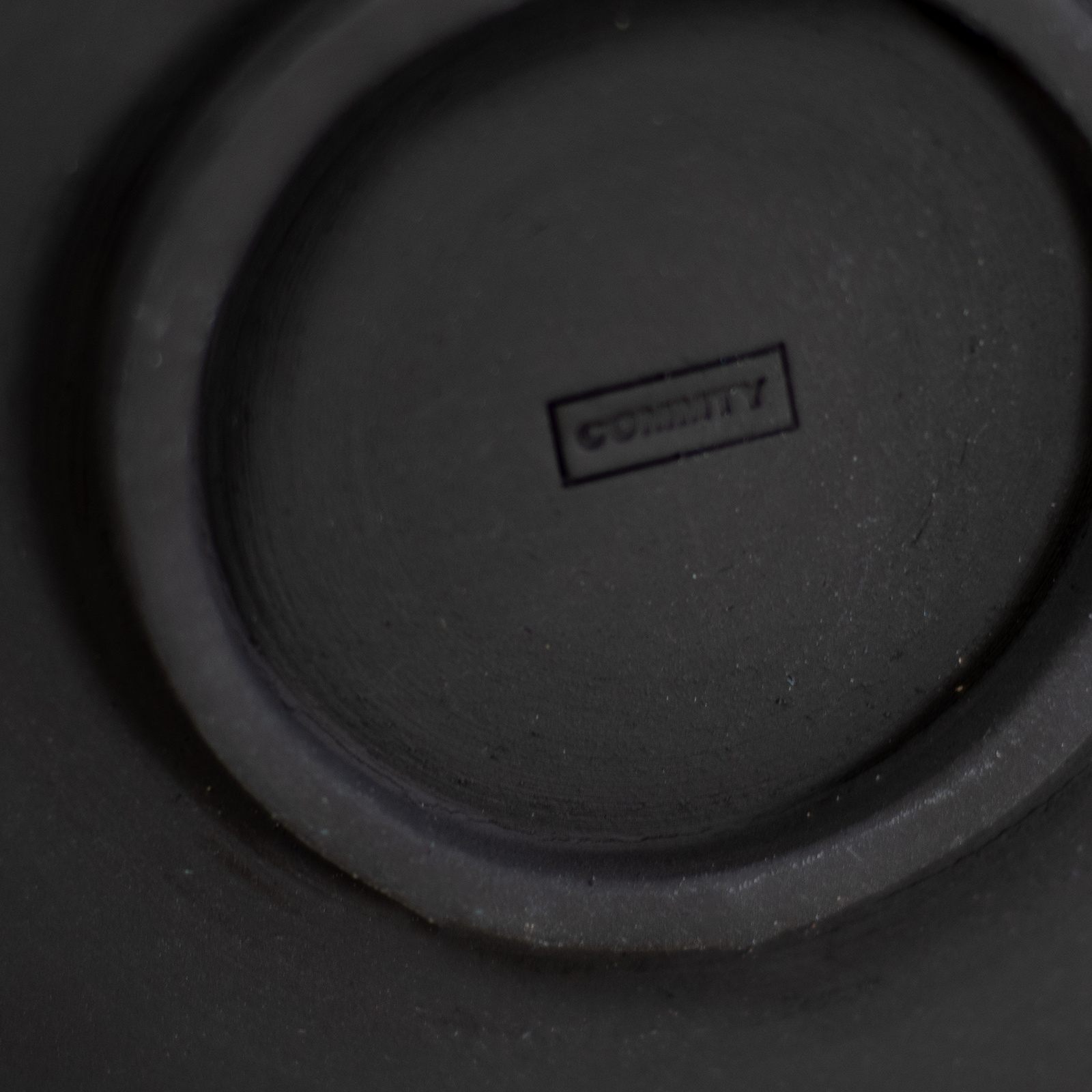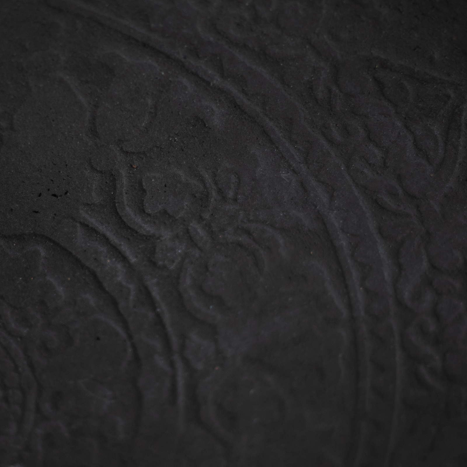 W całości wykonany ręcznie z gliny o czarnej barwie. Dekorowany tylko z frontowej strony reliefem w kształcie dużej mandali. Stemplowany logo autorki.