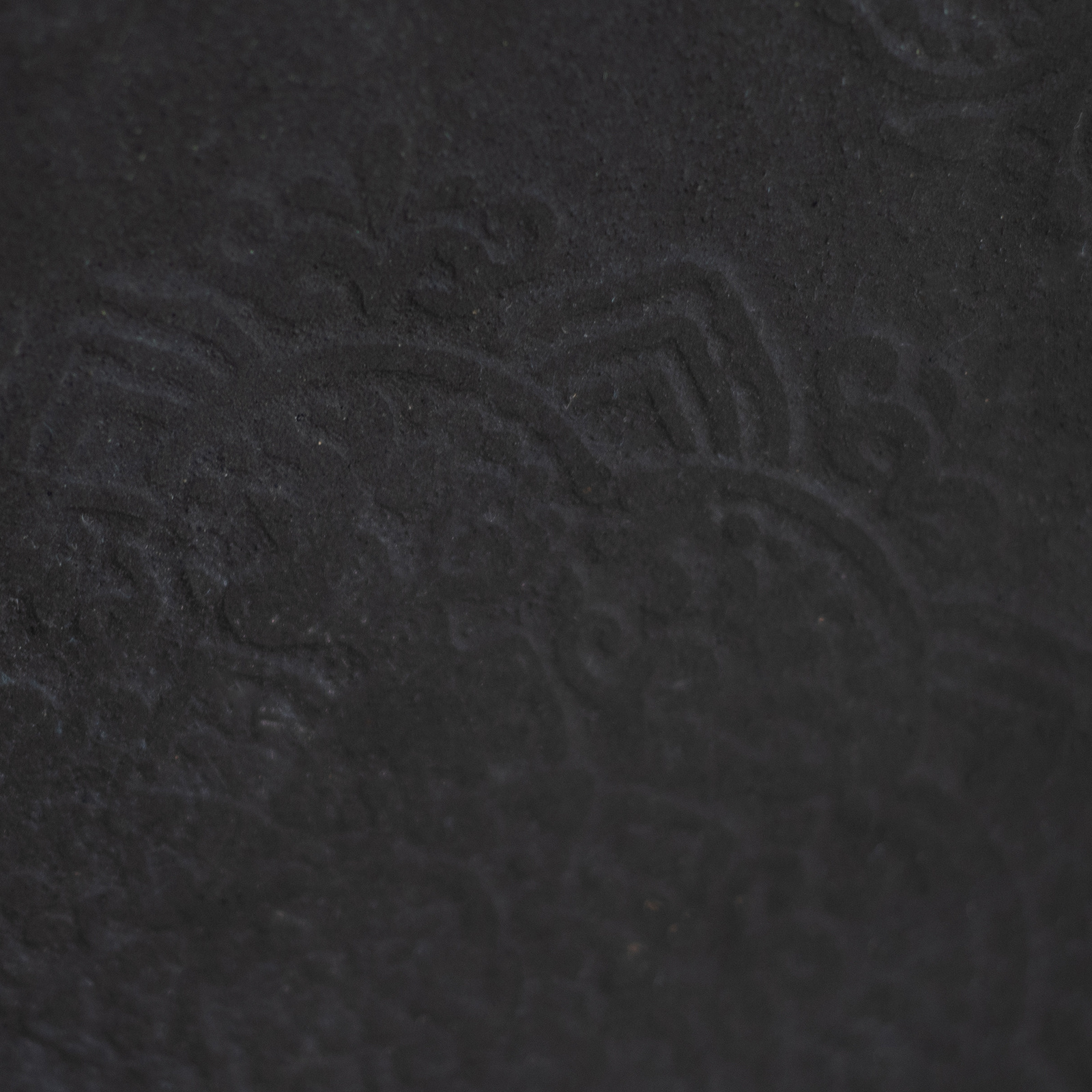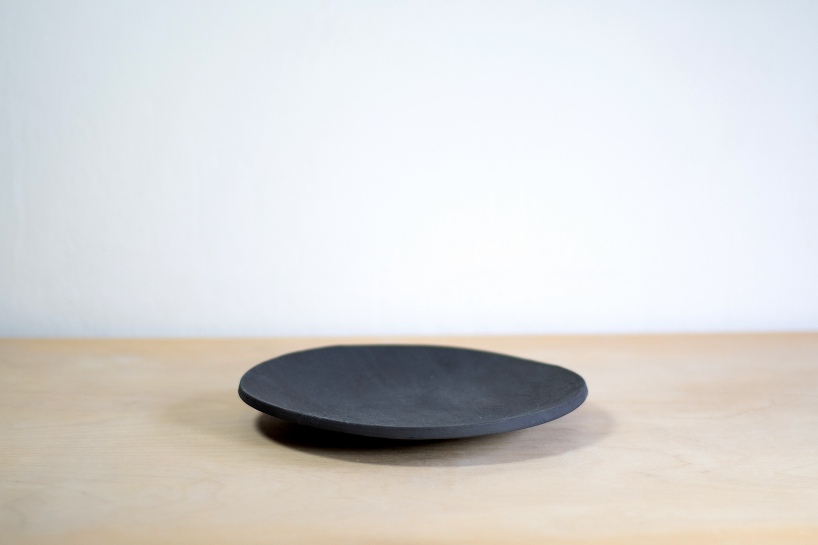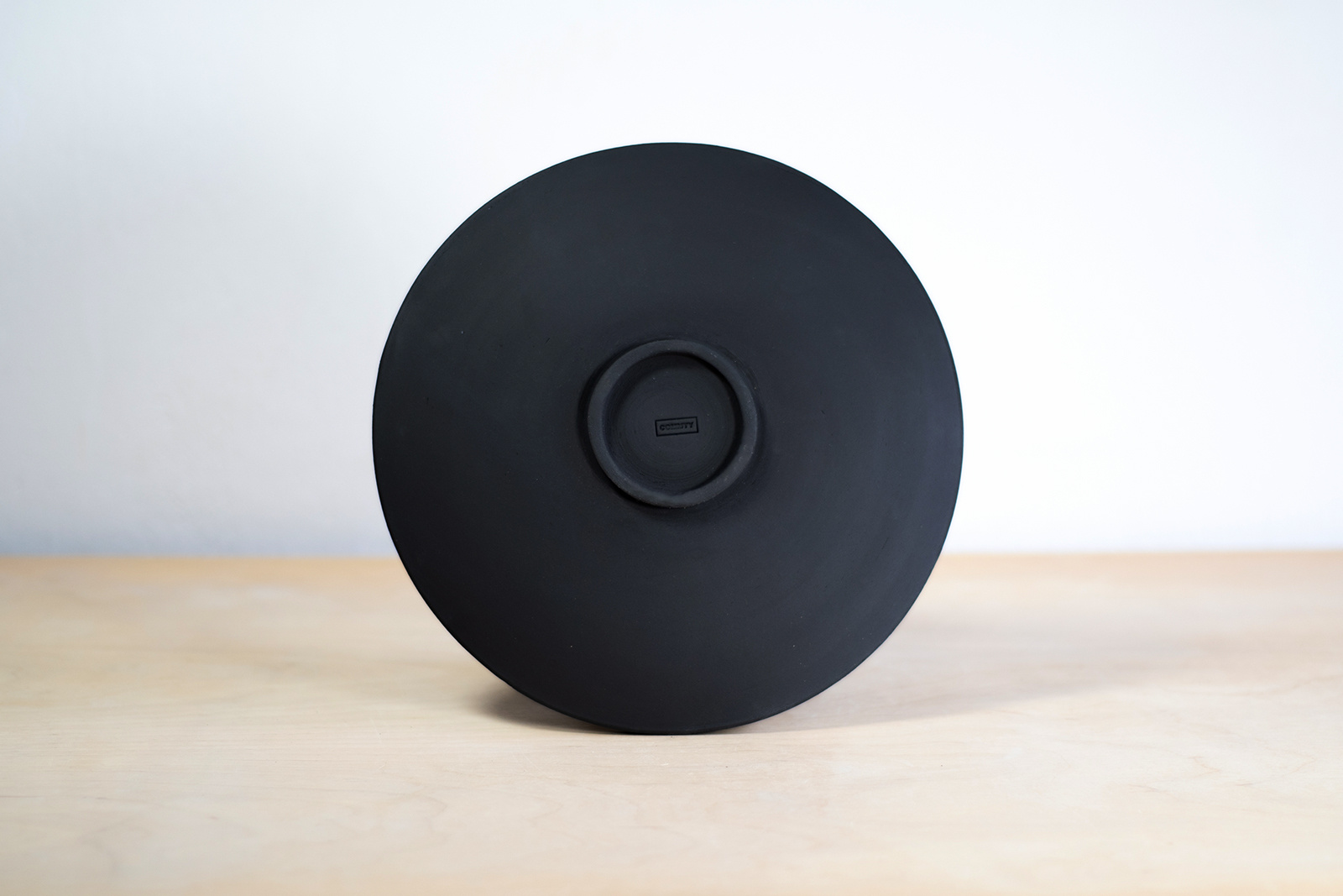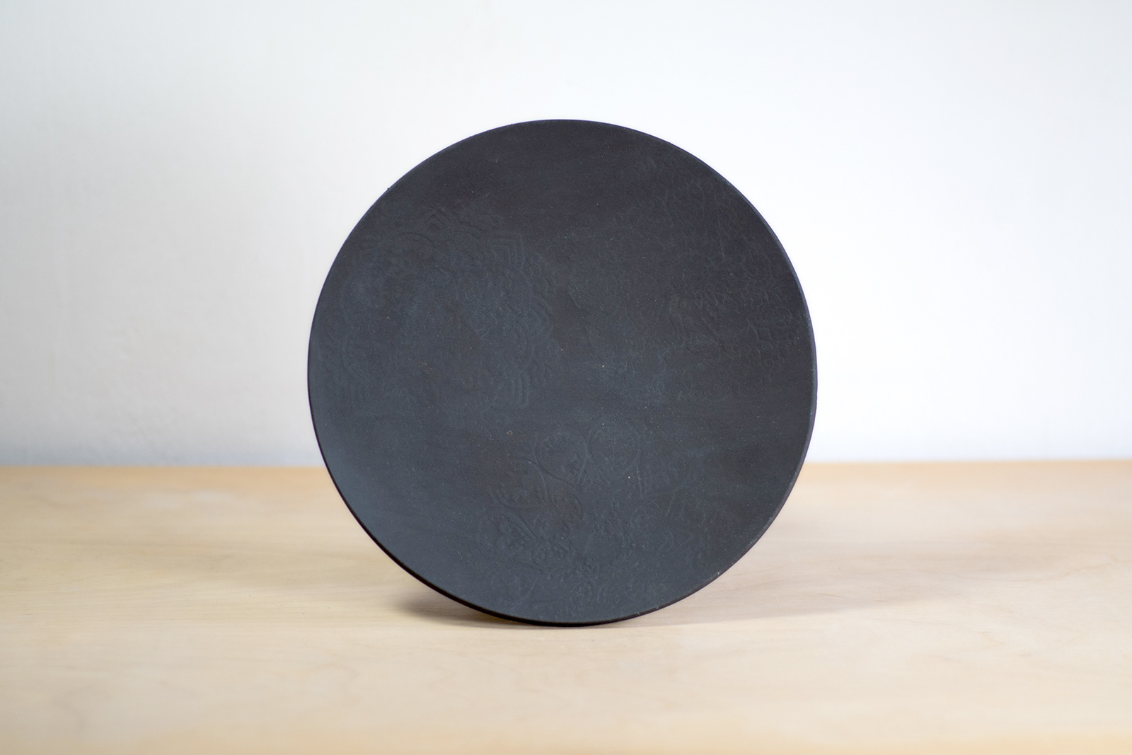 Talerz o prostej formie. W całości wykonany ręcznie z gliny o czarnej barwie. Dekorowany tylko z frontowej strony motywem geometrycznych mandali. Stemplowany logo autorki.