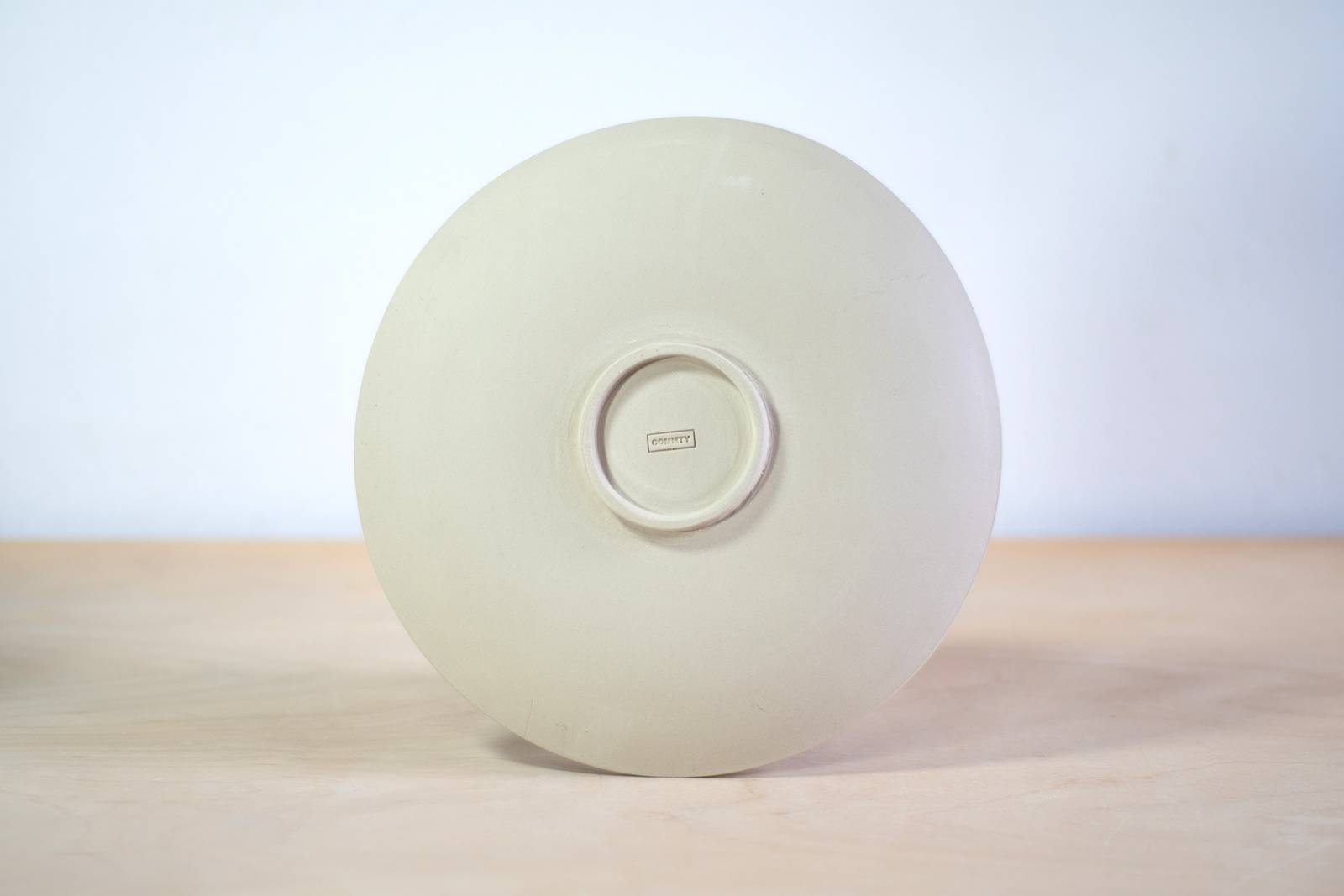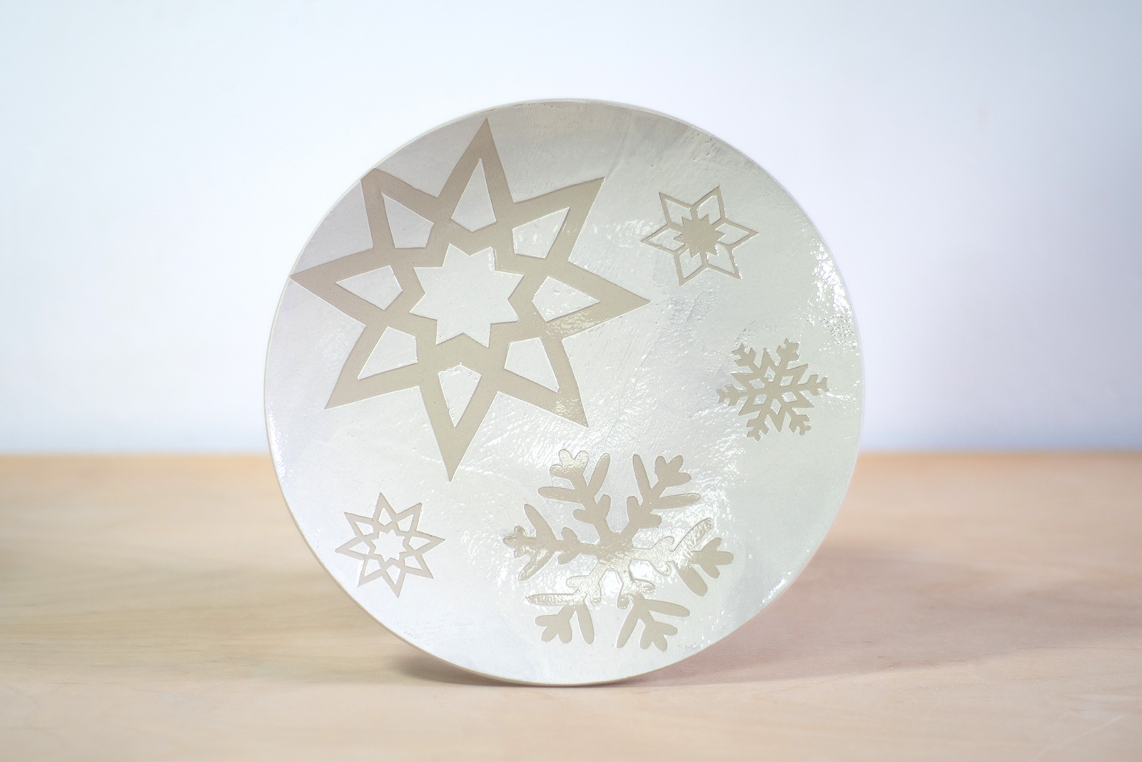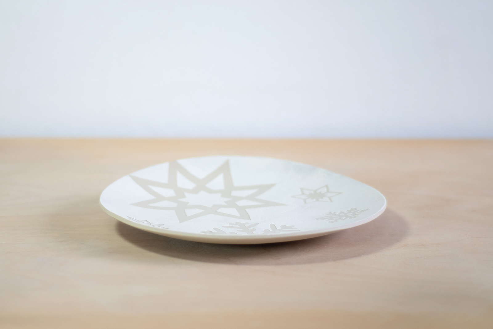 - Talerz o prostej formie. W całości wykonany ręcznie z gliny o kremowej barwie. Dekorowany tylko z frontowej strony białą angobą z płatkami śniegu. Szkliwiony transparentnym, błyszczącym szkliwem.