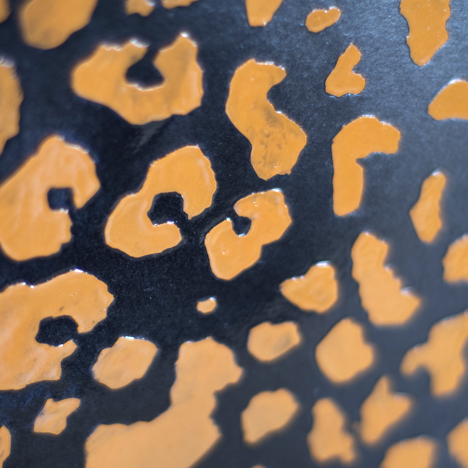 W całości wykonany ręcznie z gliny o ciemnobrązowej barwie. Dekorowany tylko z frontowej strony angobą w kształcie plamek pantery oraz transparentnym szkliwem. Stemplowany logo autorki.