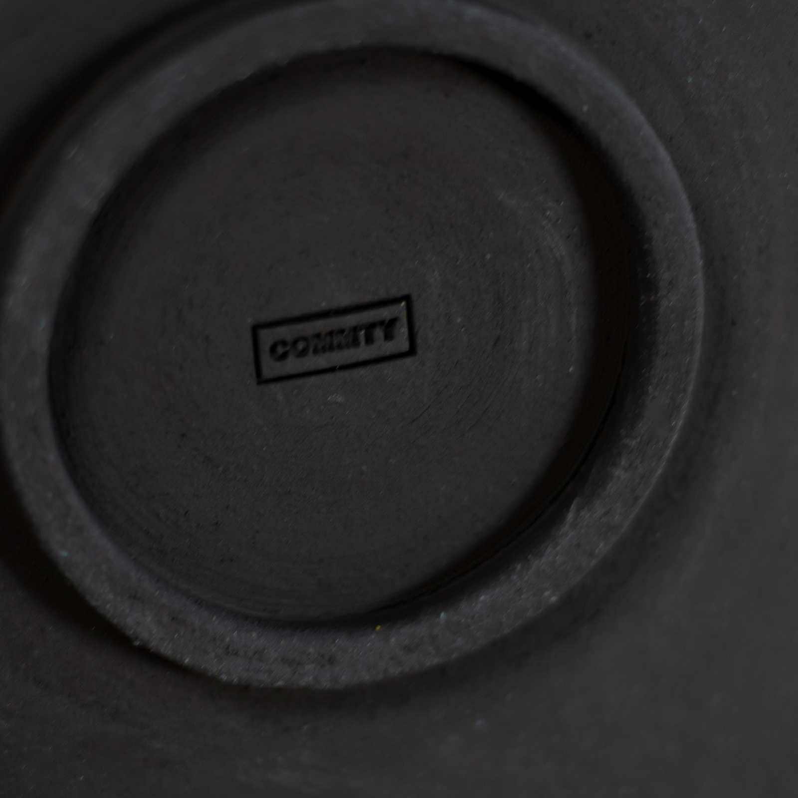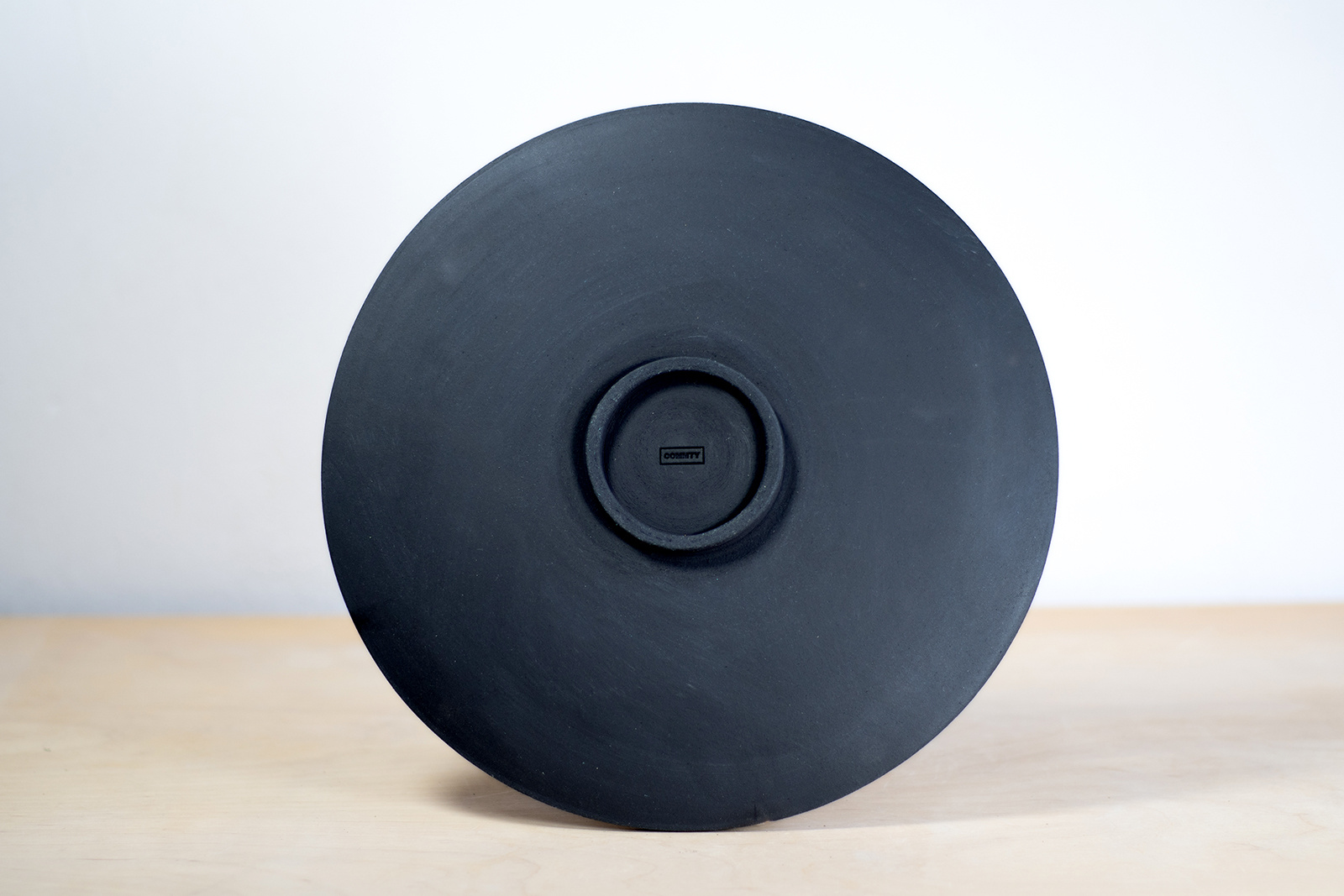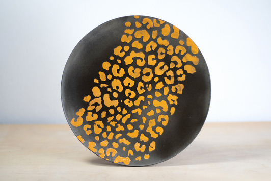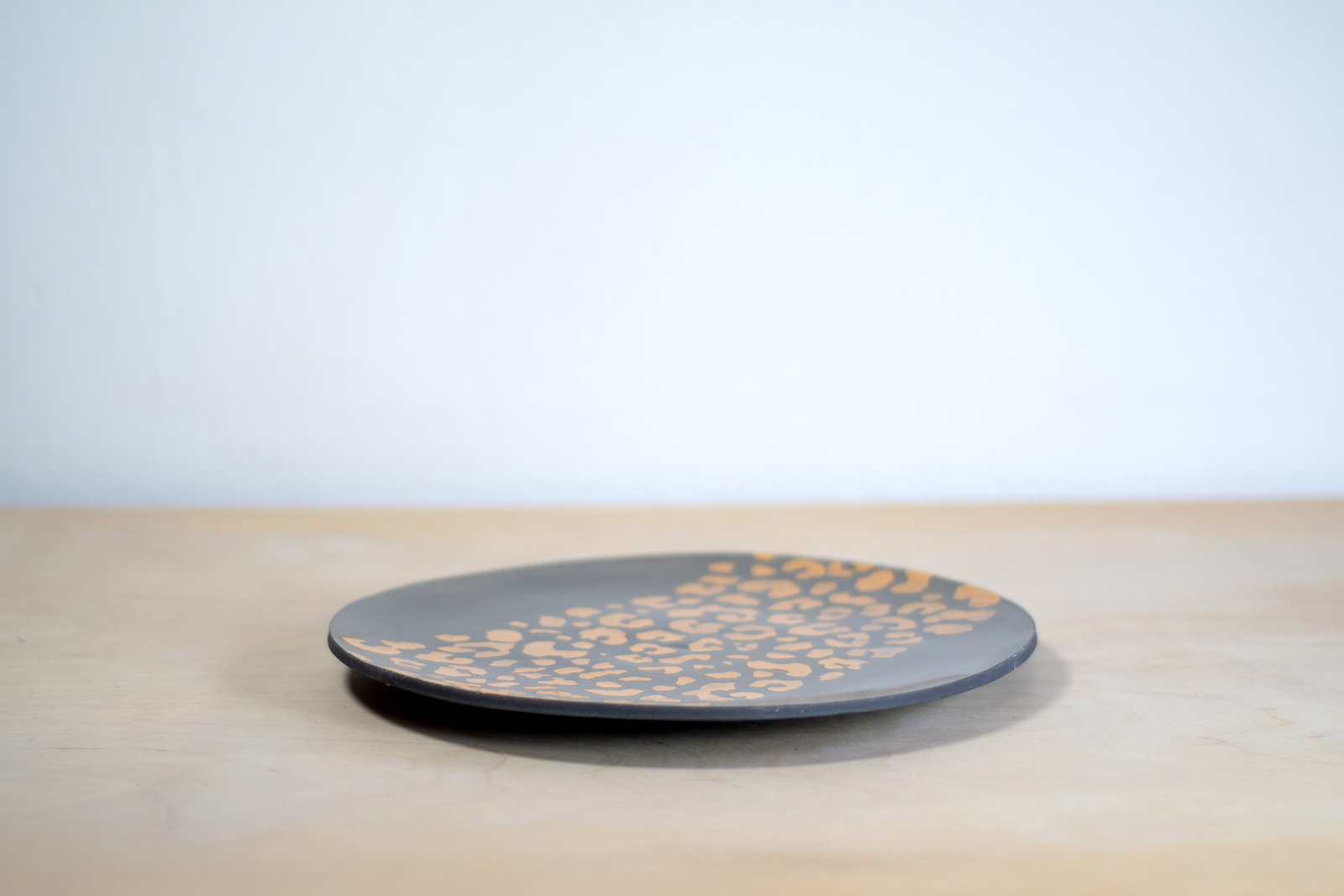 - Talerz o prostej formie. W całości wykonany ręcznie z gliny o ciemnobrązowej barwie. Dekorowany tylko z frontowej strony angobą w kształcie plamek pantery oraz transparentnym szkliwem.