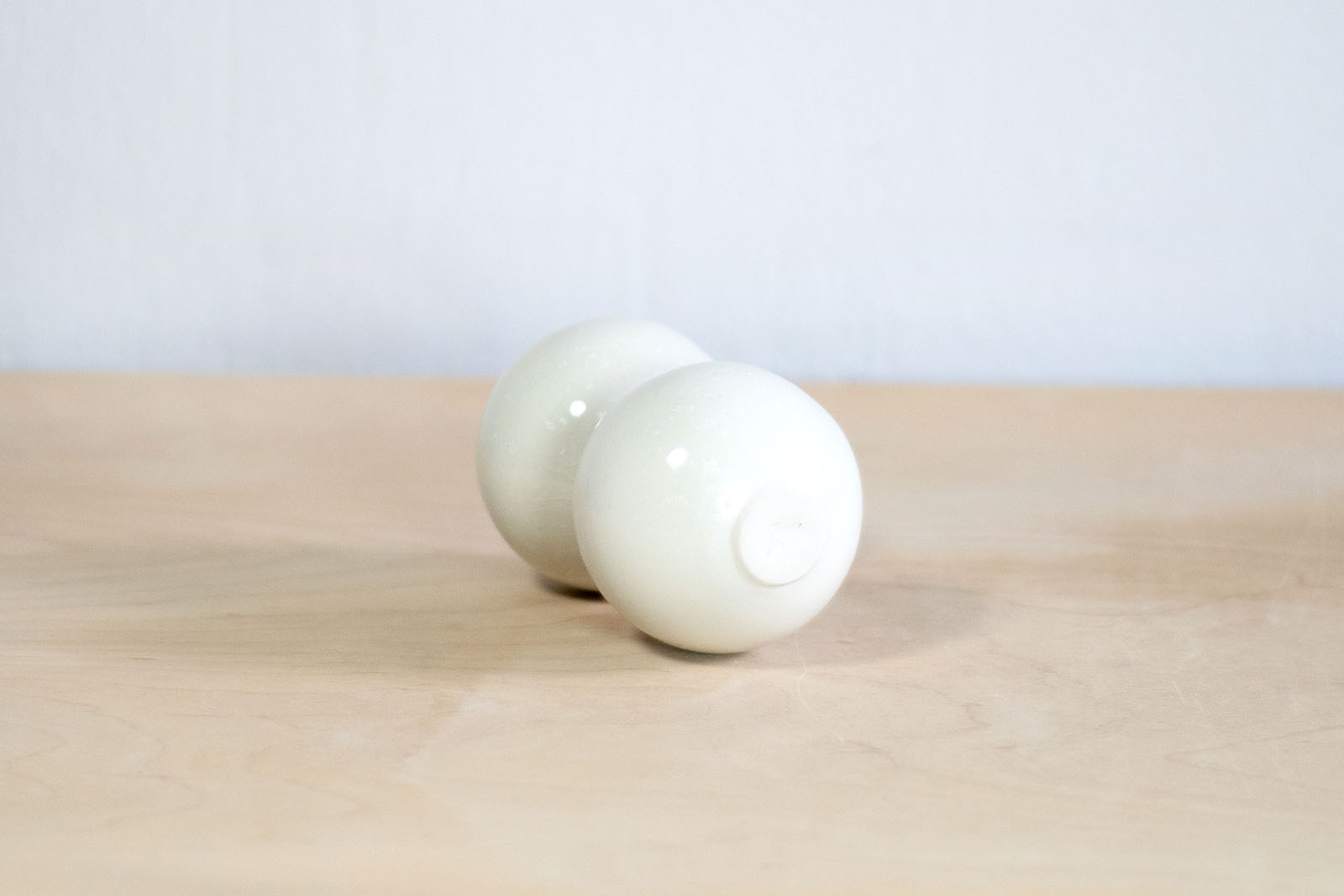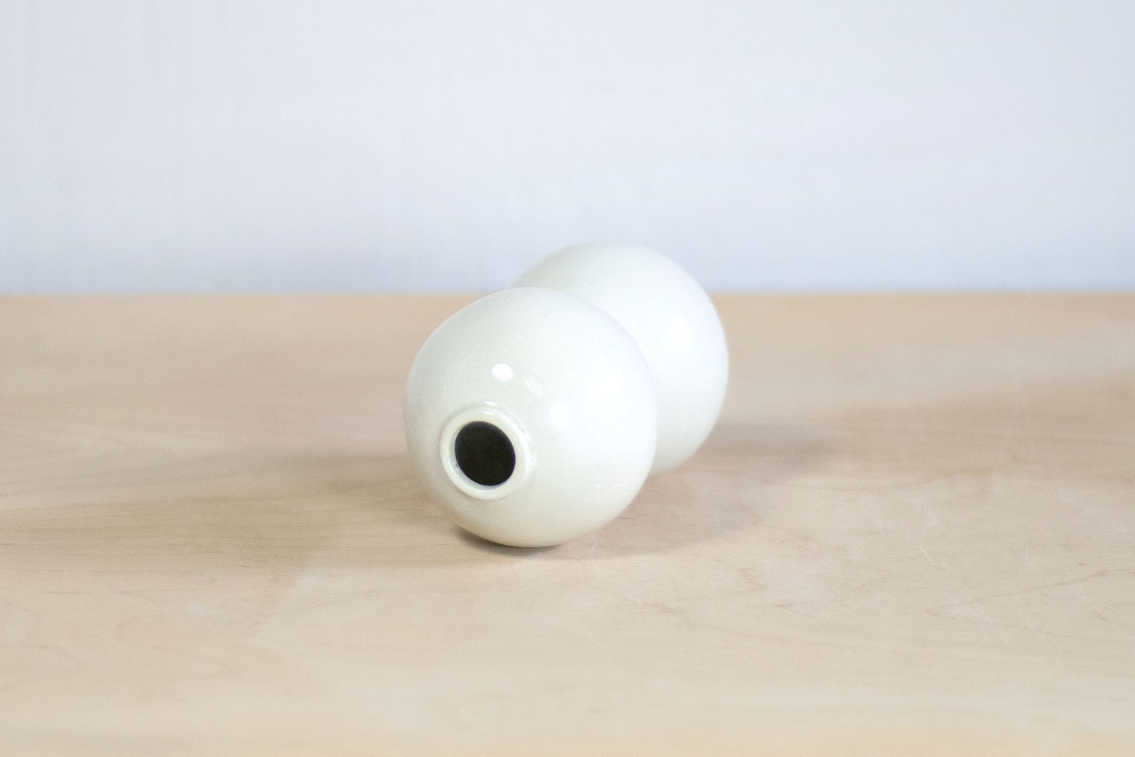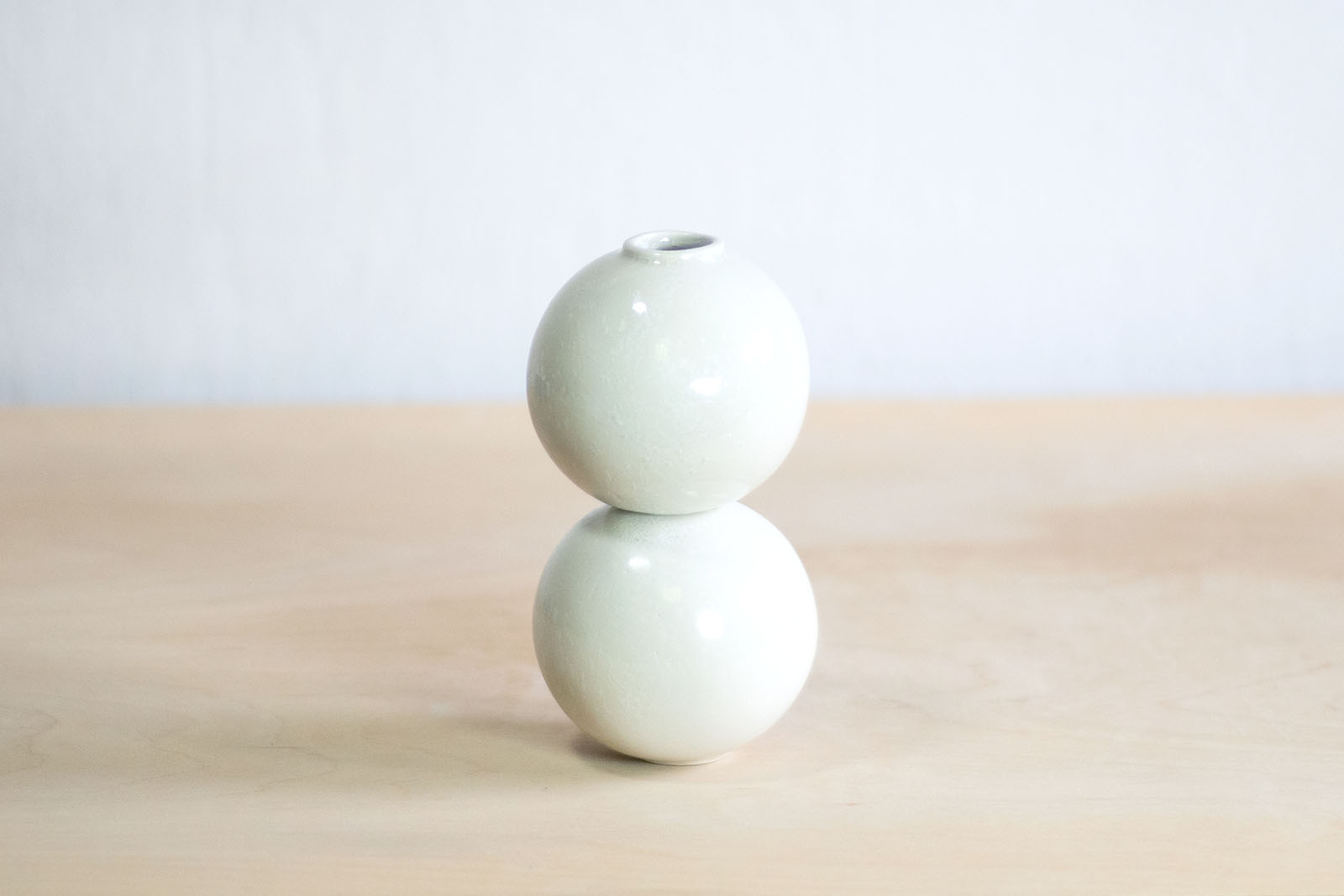Wazon o średniej wielkości, którego forma postała z 2 kul. Wykonany w całości z jasnej masy lejnej. Pokryty szkliwem z małymi kryształami oraz widocznymi pęknięciami. Stemplowany logo autorki.