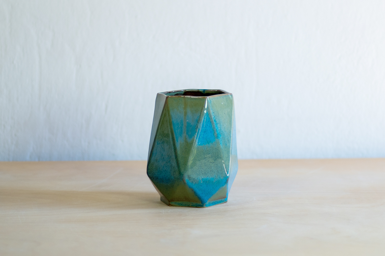Wazon inspirowany sztuką origami. Odlany z masy lejnej o jasnej, kremowej barwie. Pokryty w całości turkusowym, błyszczącym szkliwem. Stemplowany logo autorki.