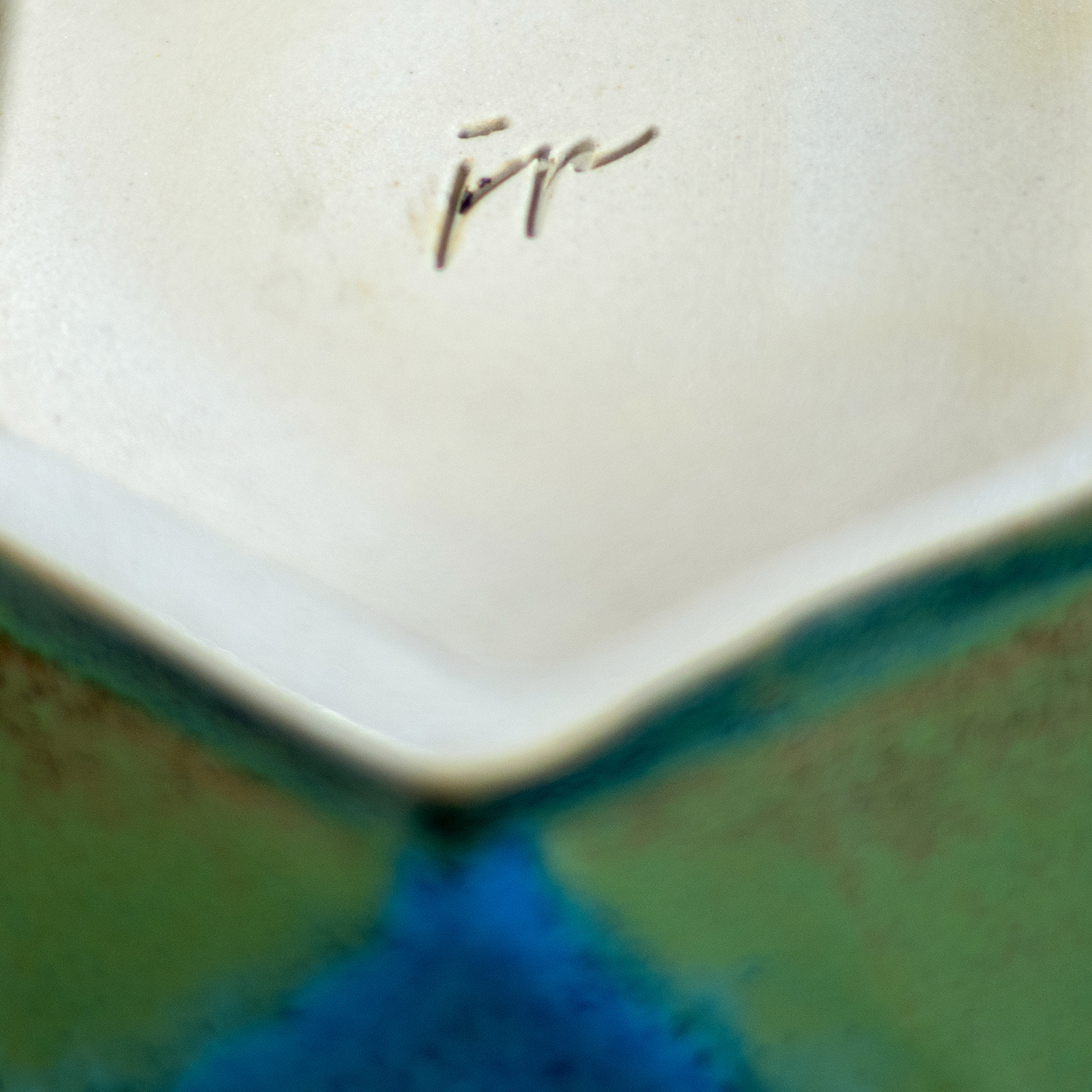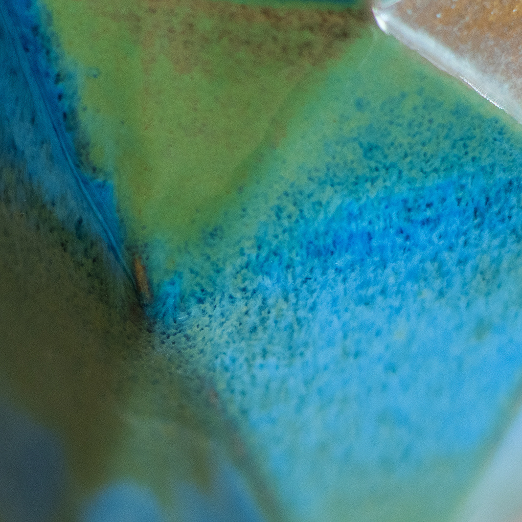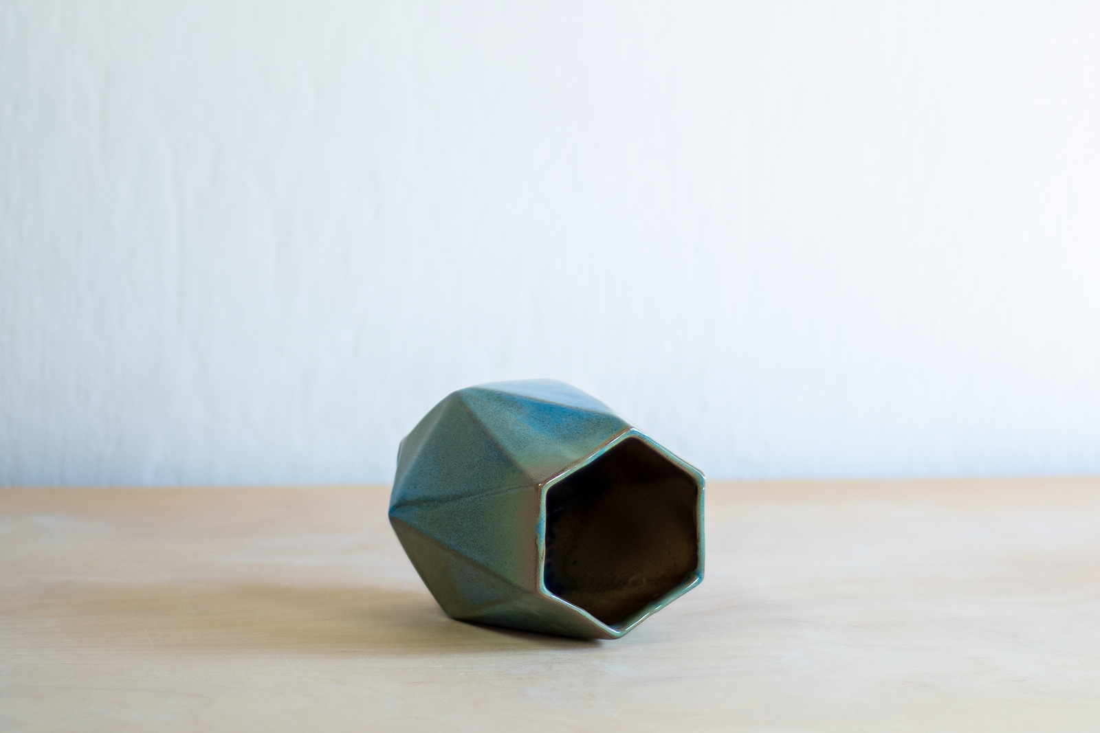 • Wazon inspirowany sztuką origami. Odlany z masy lejnej o jasnej, kremowej barwie. Pokryty w całości turkusowym, błyszczącym szkliwem.