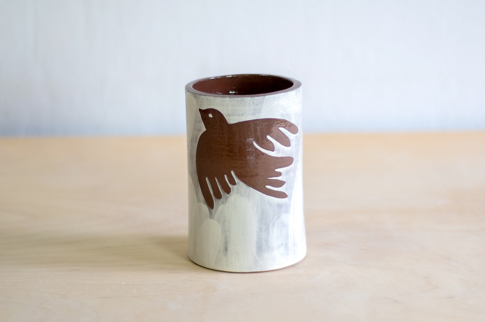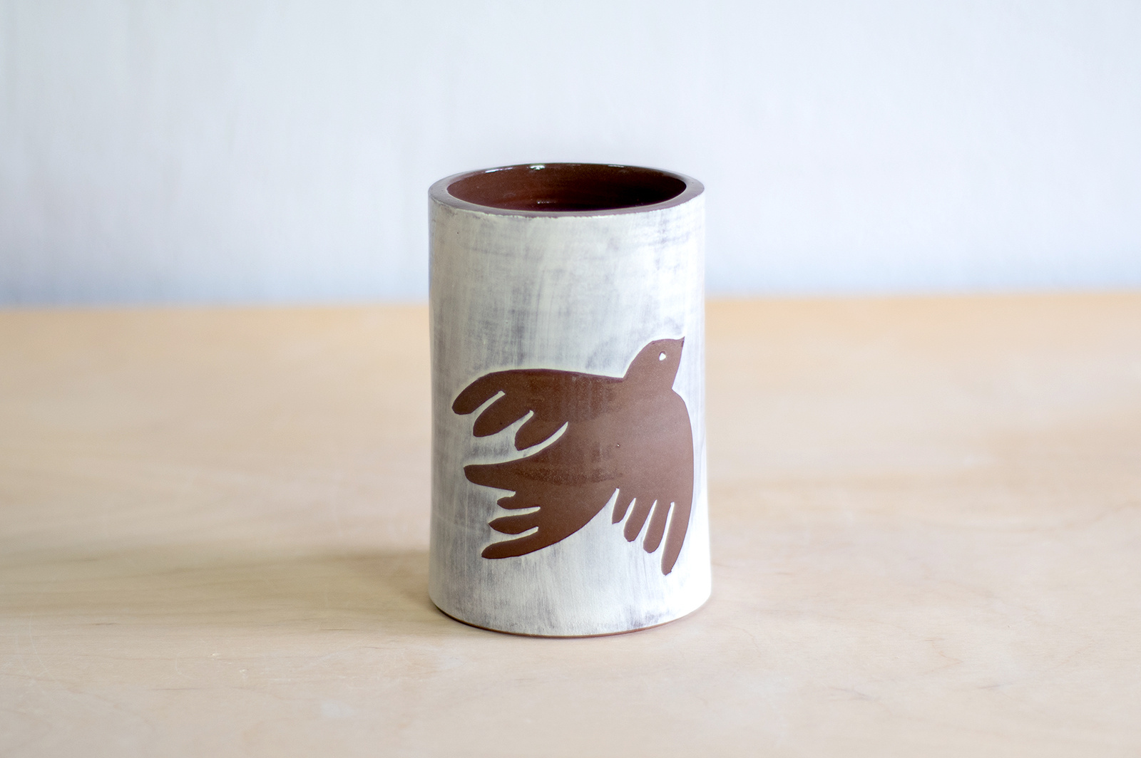 - Wazon o klasycznym kształcie walca. W całości wykonany na kole garncarskim z gliny w kolorze brązowym. Dekorowany ręcznie wycinanką w ptaki i białą angobą. Całość pokryta błyszczącym transparentnym szkliwem.