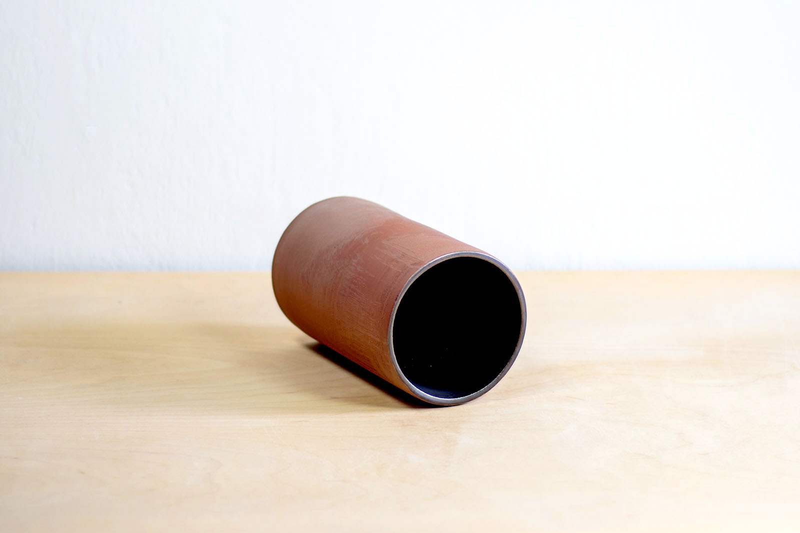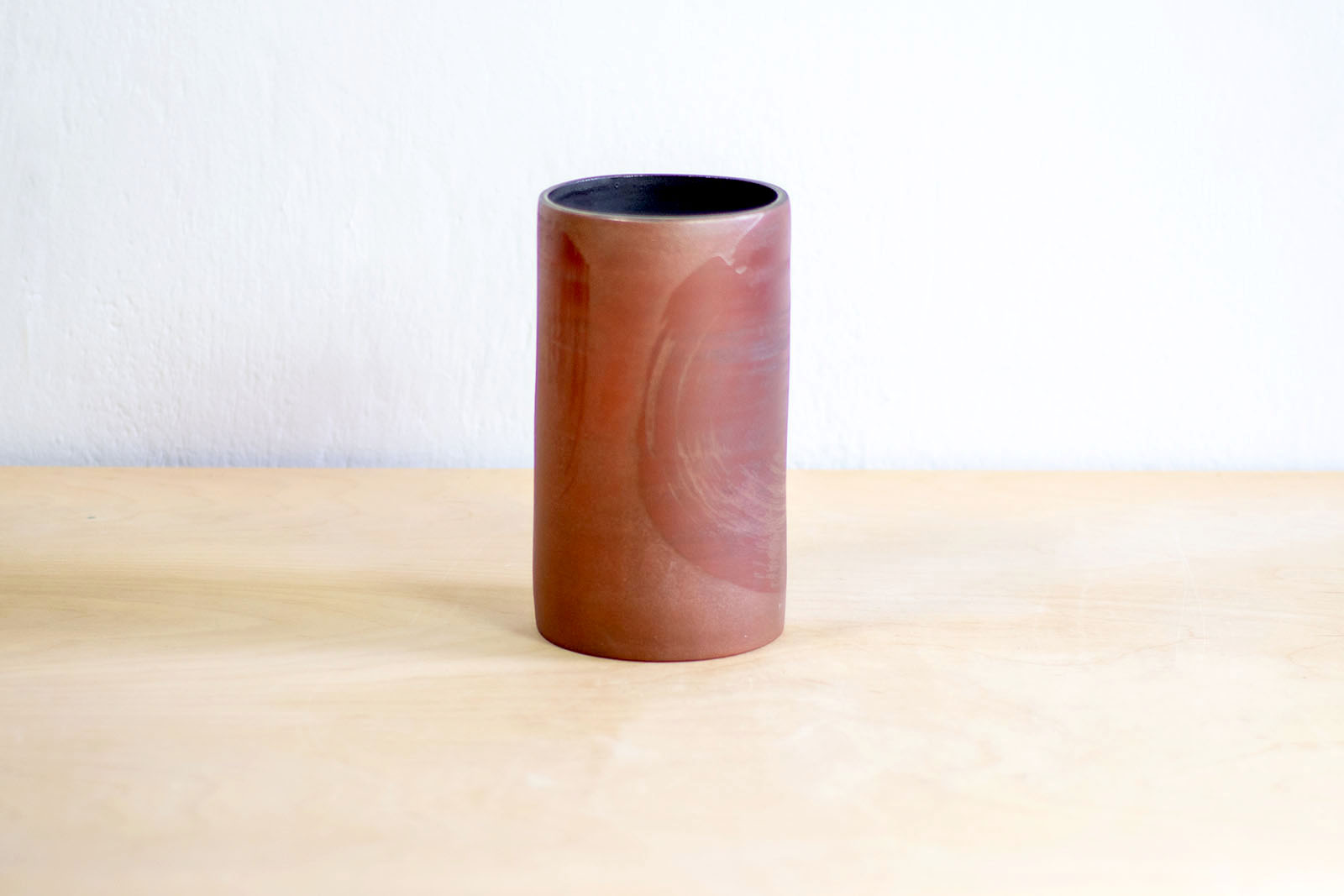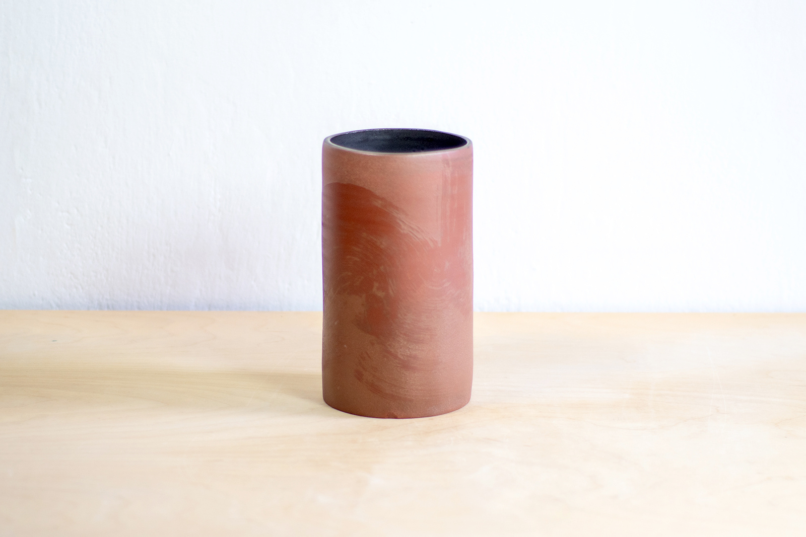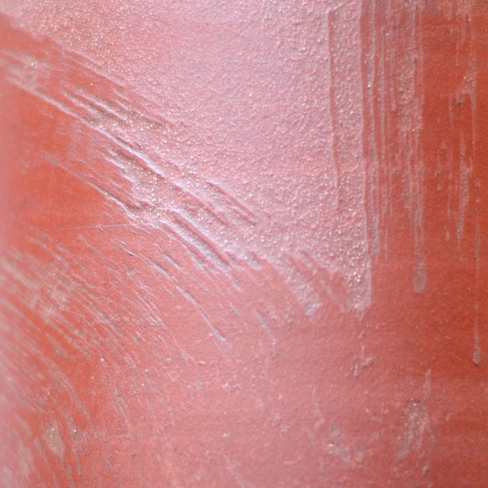 • Duży wazon w kształcie walca. Wykonany ręcznie z bordowej gliny. Dekorowany delikatną fakturą wykonaną szerokim pędzlem. Wewnątrz szkliwiony brązowym, satynowym szkliwem.