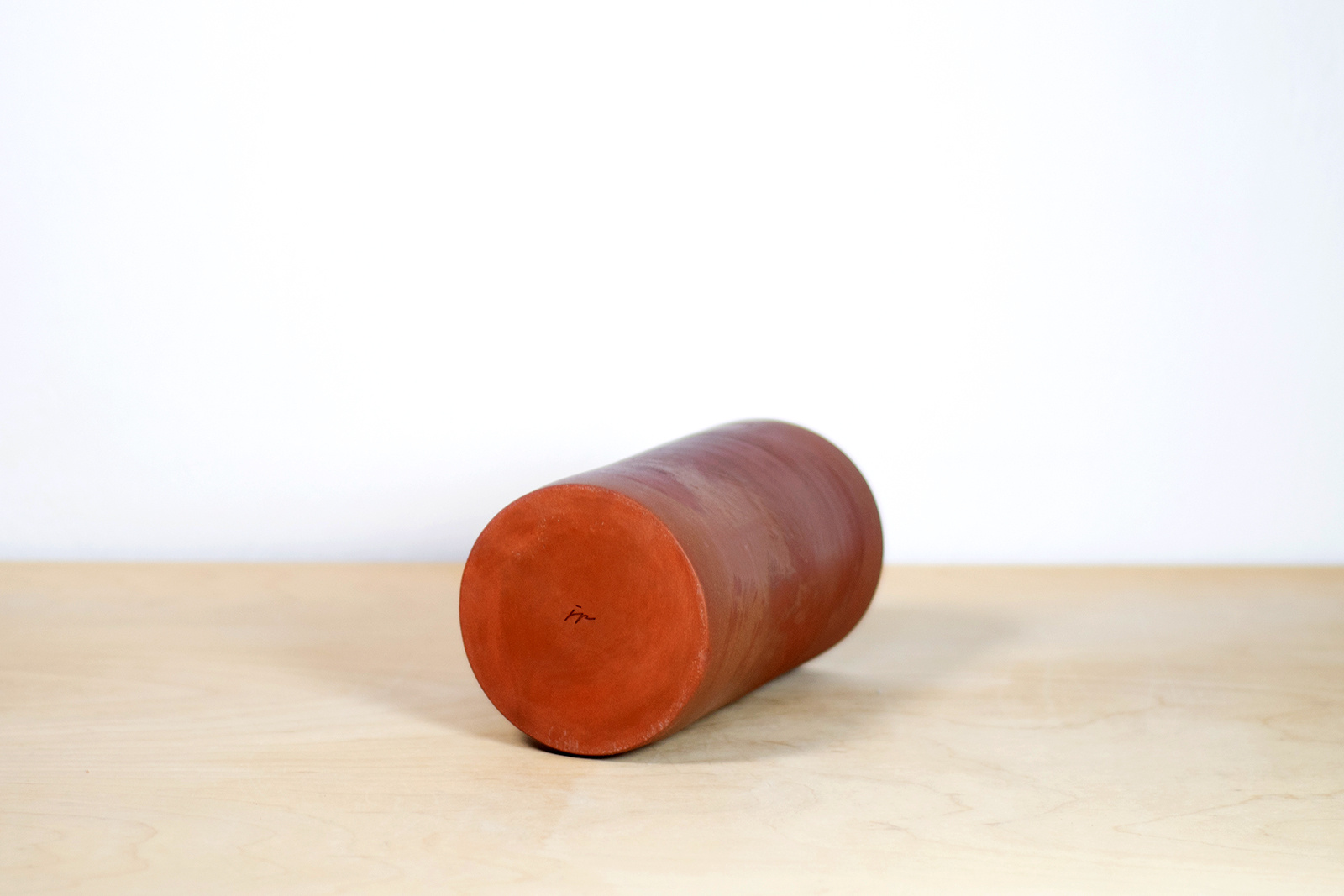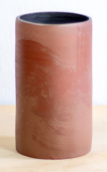 Duży wazon w kształcie walca. Wytoczony na kole garncarskim z bordowej gliny. Dekorowany delikatną fakturą, wykonaną szerokim pędzlem. Wewnątrz szkliwiony brązowym, satynowym szkliwem. Stemplowany logo autorki.
