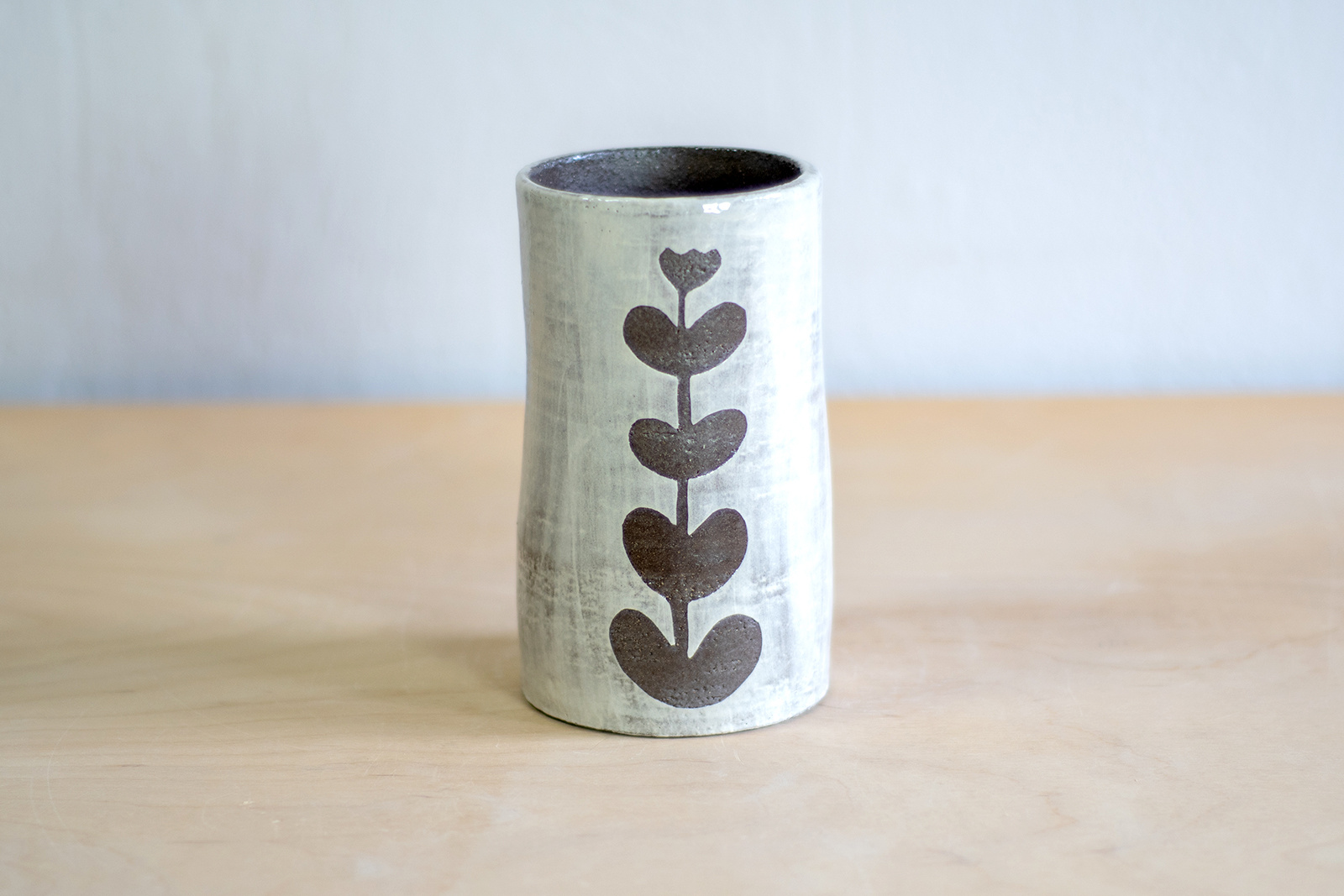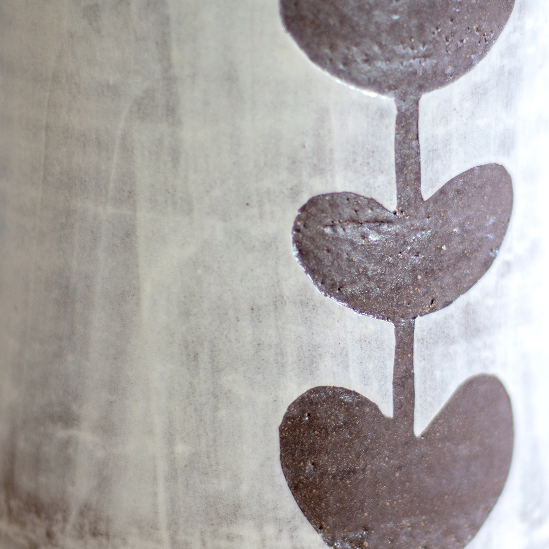 W całości wykonany na kole garncarskim z gliny w kolorze czarnym. Dekorowany ręcznie wycinanką kwiatową i białą angobą. Całość pokryta błyszczącym transparentnym szkliwem. Stemplowany logo autorki.