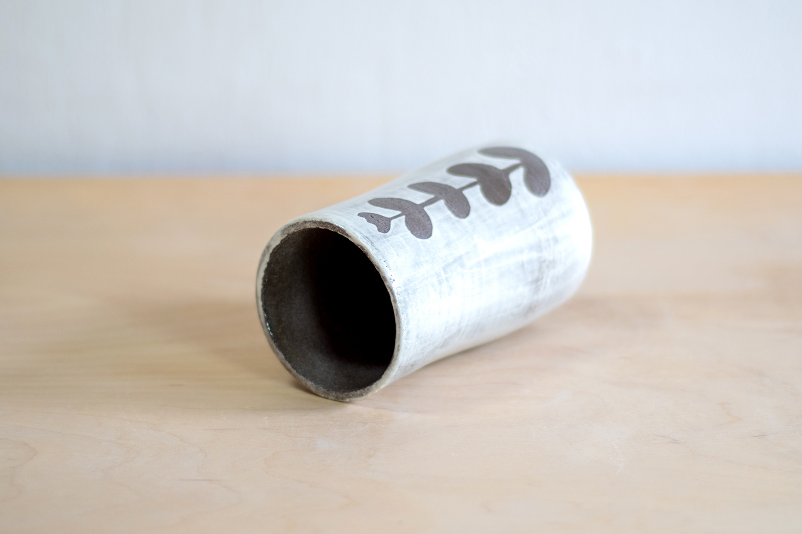 - Wazon o klasycznym kształcie walca. W całości wykonany na kole garncarskim z gliny w kolorze czarnym. Dekorowany ręcznie wycinanką kwiatową i białą angobą. Całość pokryta błyszczącym transparentnym szkliwem.