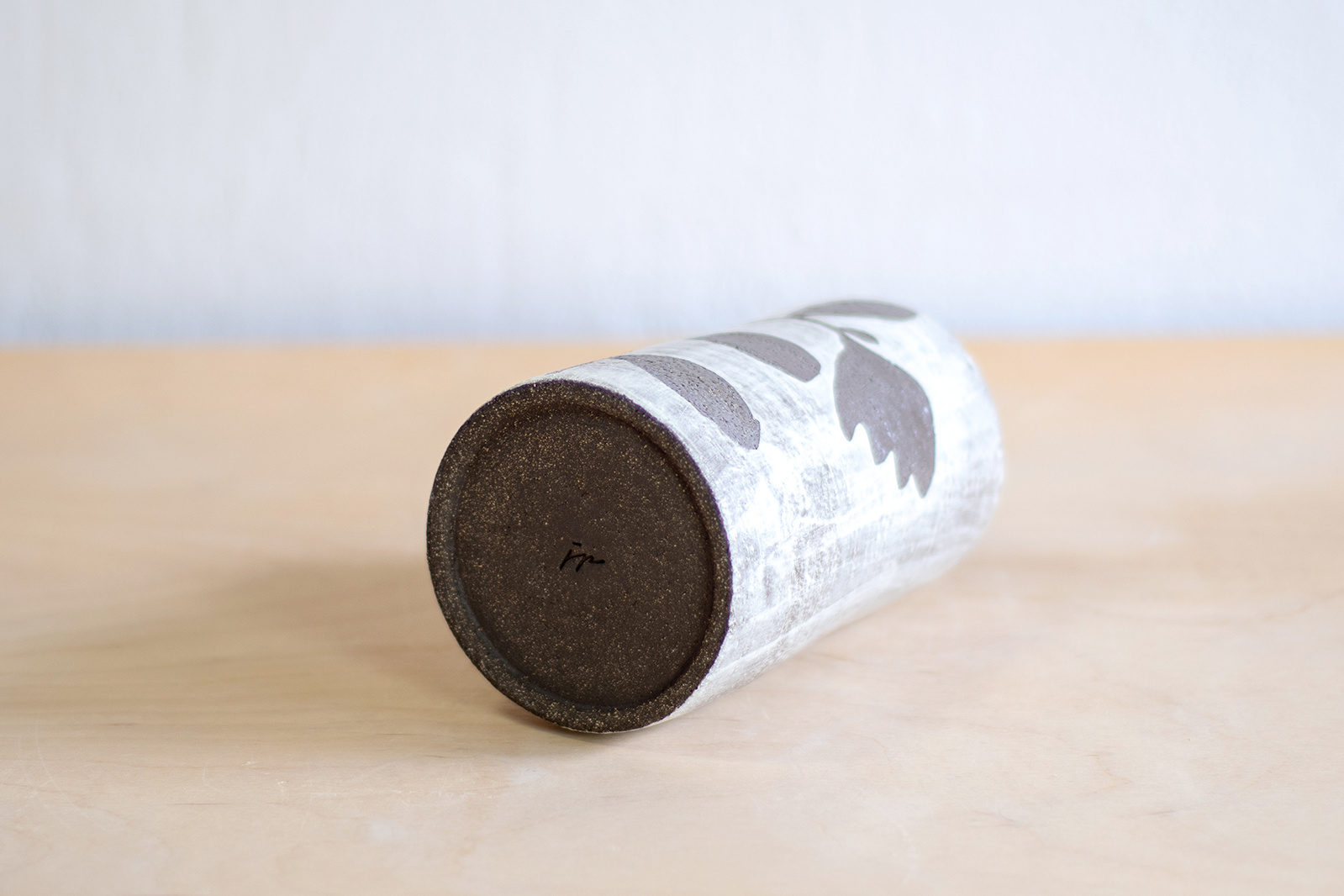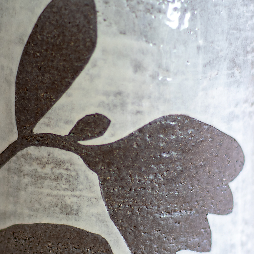 W całości wykonany na kole garncarskim z gliny w kolorze czarnym. Dekorowany ręcznie wycinanką kwiatową i białą angobą. Całość pokryta błyszczącym transparentnym szkliwem. Stemplowany logo autorki.