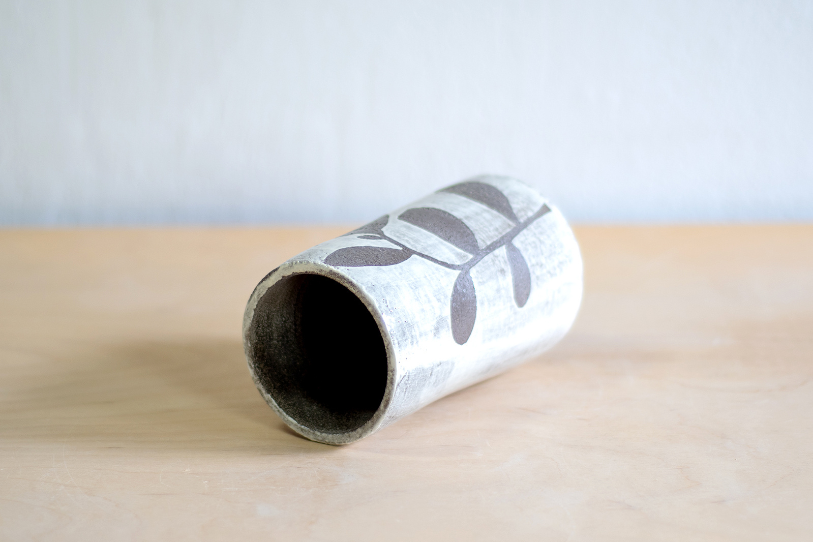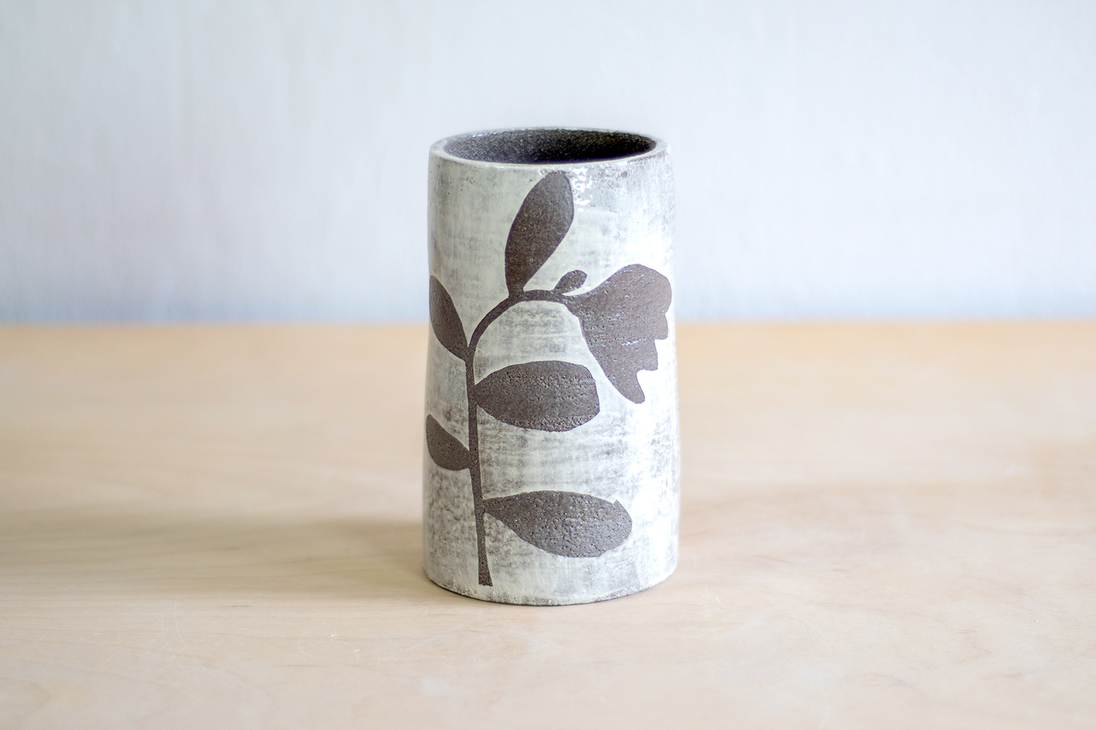 - Wazon o klasycznym kształcie walca. W całości wykonany na kole garncarskim z gliny w kolorze czarnym. Dekorowany ręcznie wycinanką kwiatową i białą angobą. Całość pokryta błyszczącym transparentnym szkliwem.