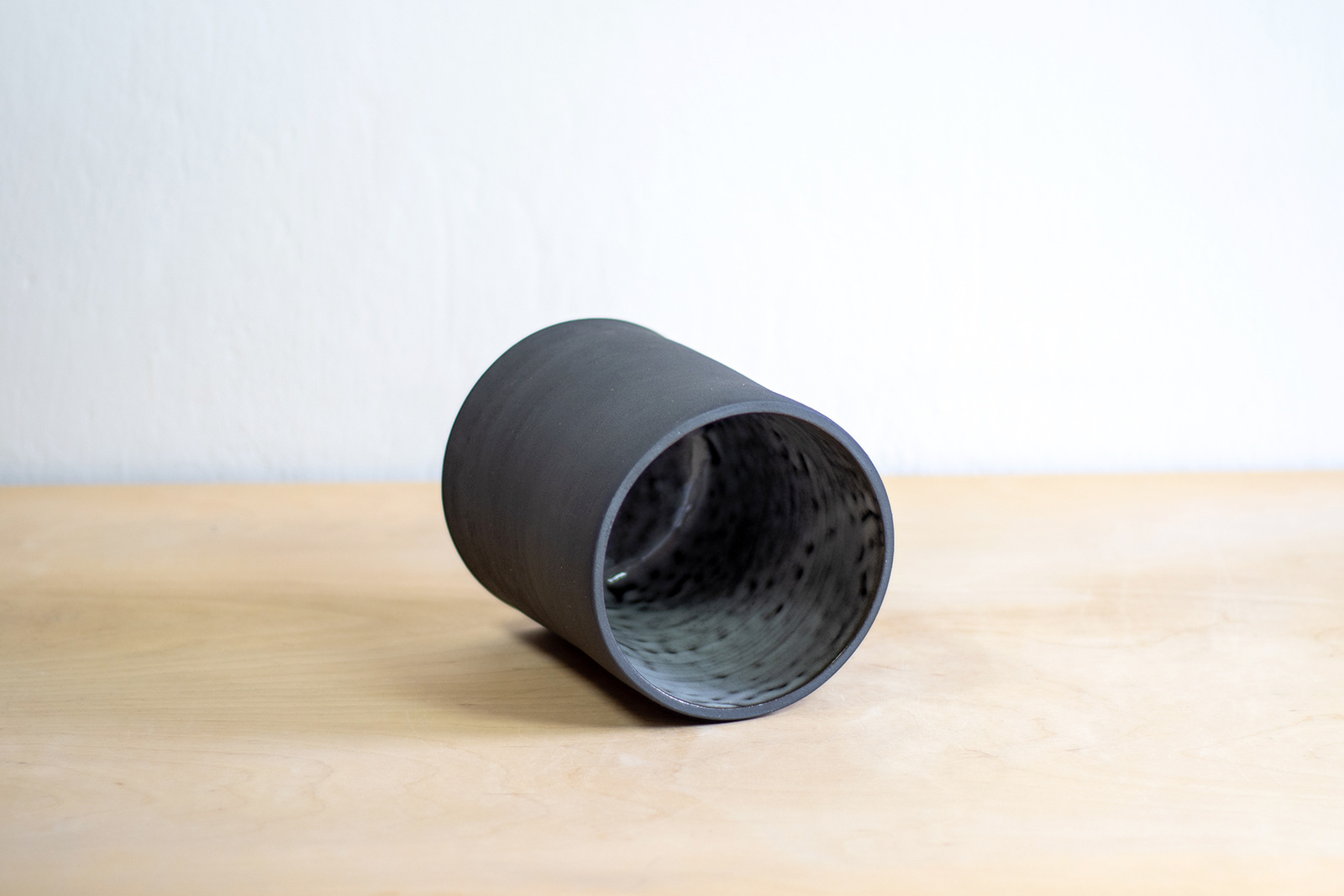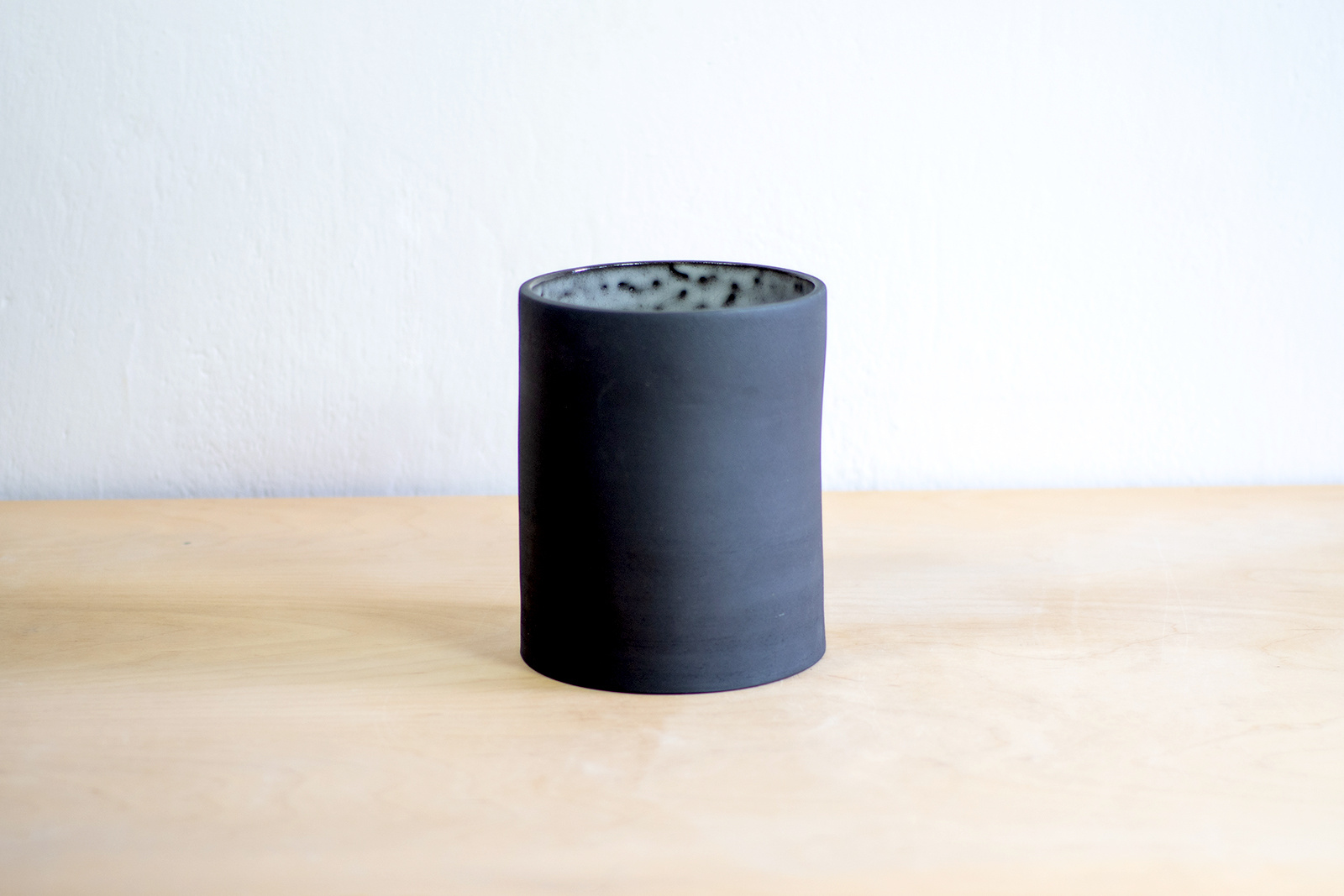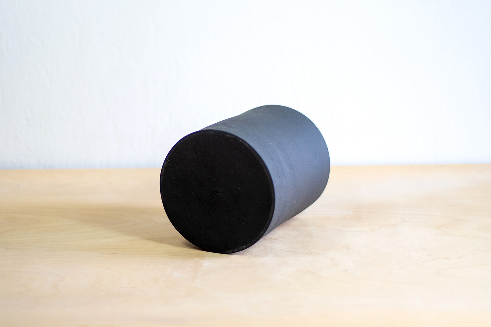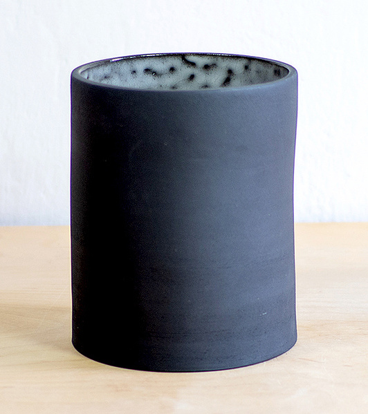 - Wazon wykonany z czarnej gliny w kształcie prostego walca. Porowata powierzchnia nadaje surowego, ale też szlachetnego charakteru. Wewnątrz proszkliwiony białym, transparentnym szkliwem o efektowej strukturze.