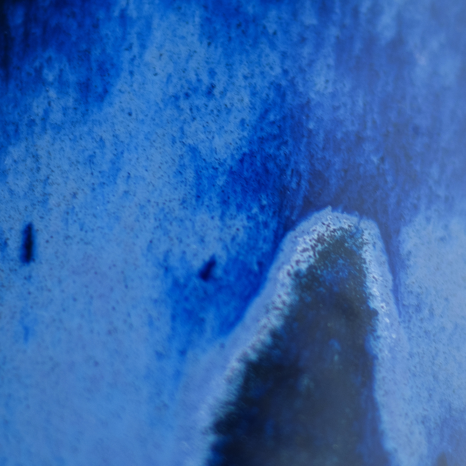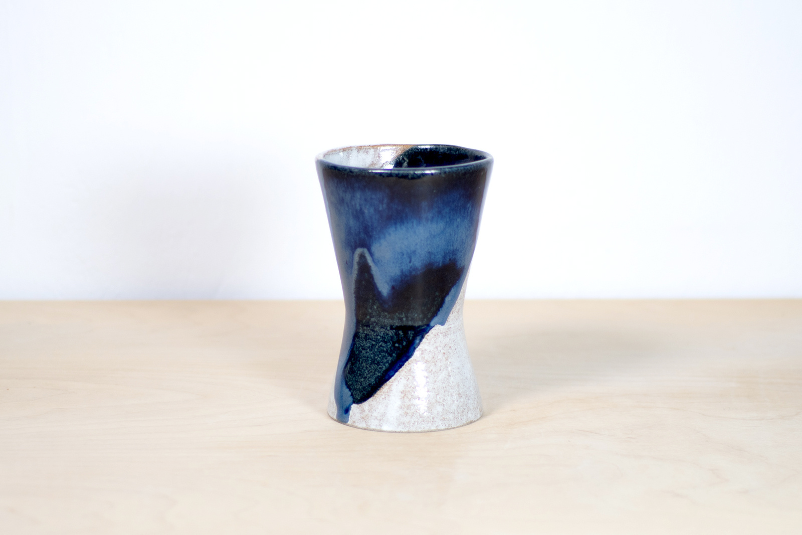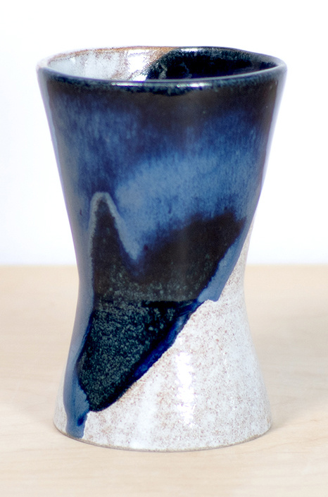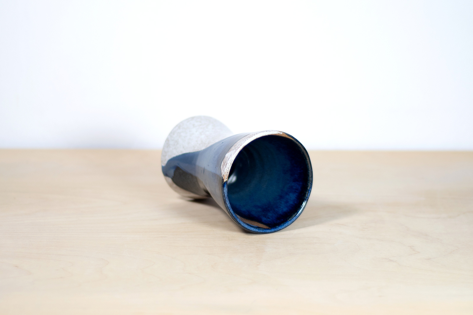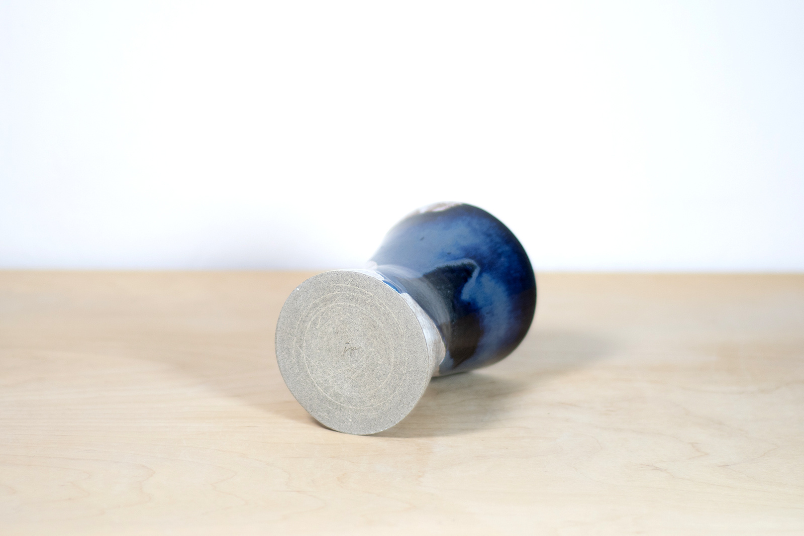 Wazon o kształcie klepsydry. Wytoczony na kole garncarskim. Wykonany z gliny w kolorze szarego betonu. Pokryty w całości kombinacją błyszczących szkliw w kolorach niebieskich oraz białym. Stemplowany logo autorki.