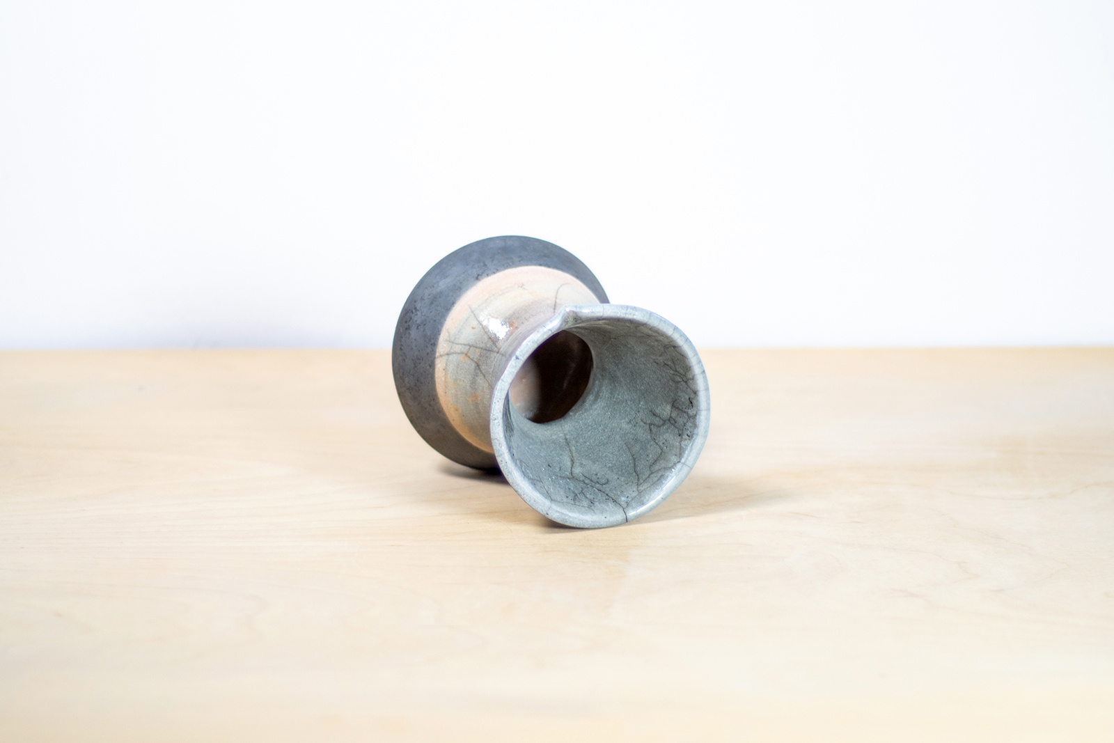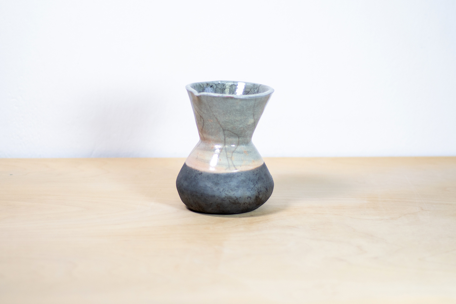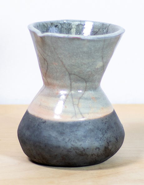 - Wazon w kształcie klepsydry. Wykonany ręcznie na kole garncarskim. Dekorowany szkliwem w kolorze szarym. Wypalony w technice raku, dzięki czemu zyskał piękne spękania i przebarwienia na powierzchni szkliwa oraz szlachetnie wyczernioną część bez szkliwa.