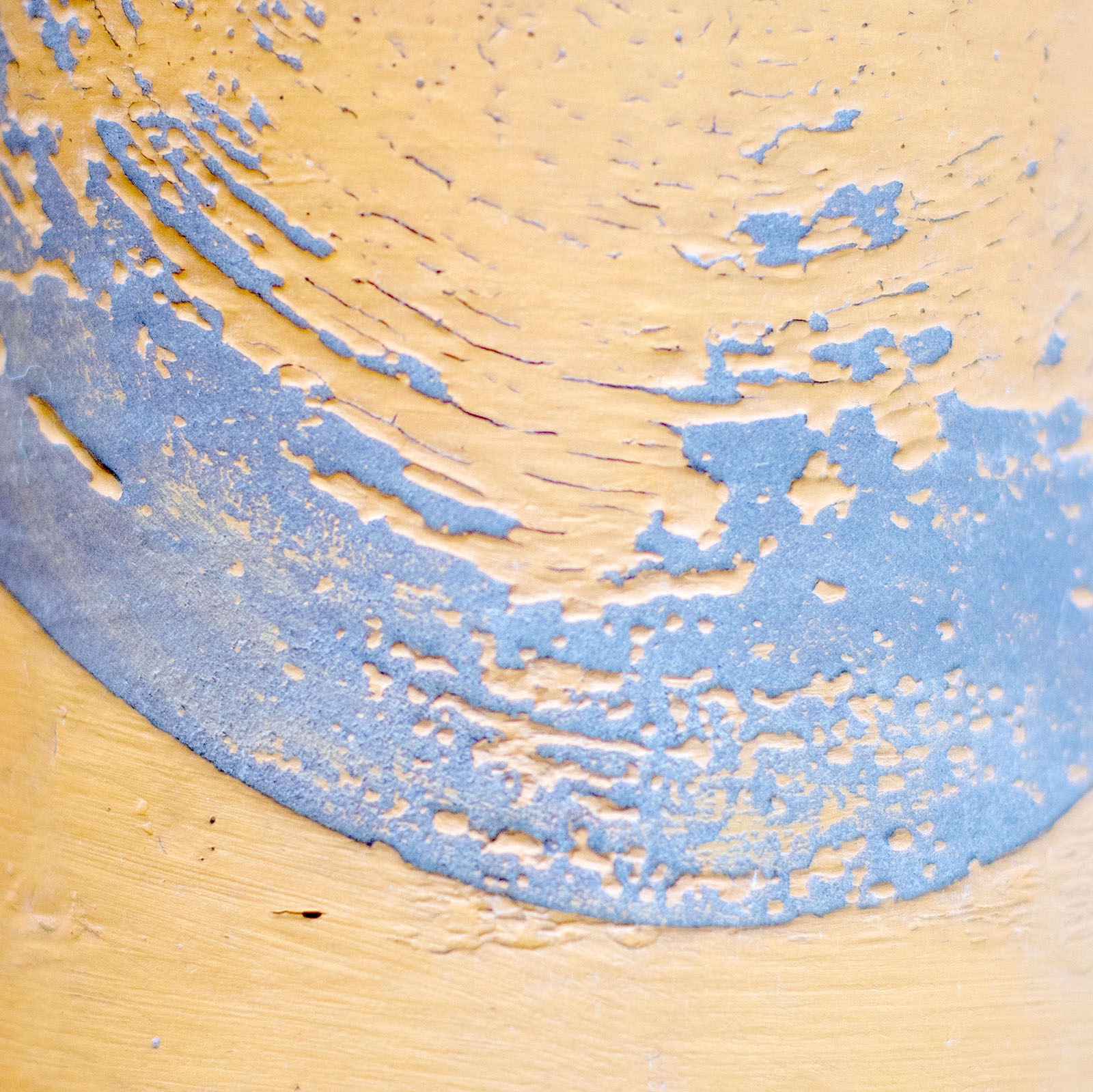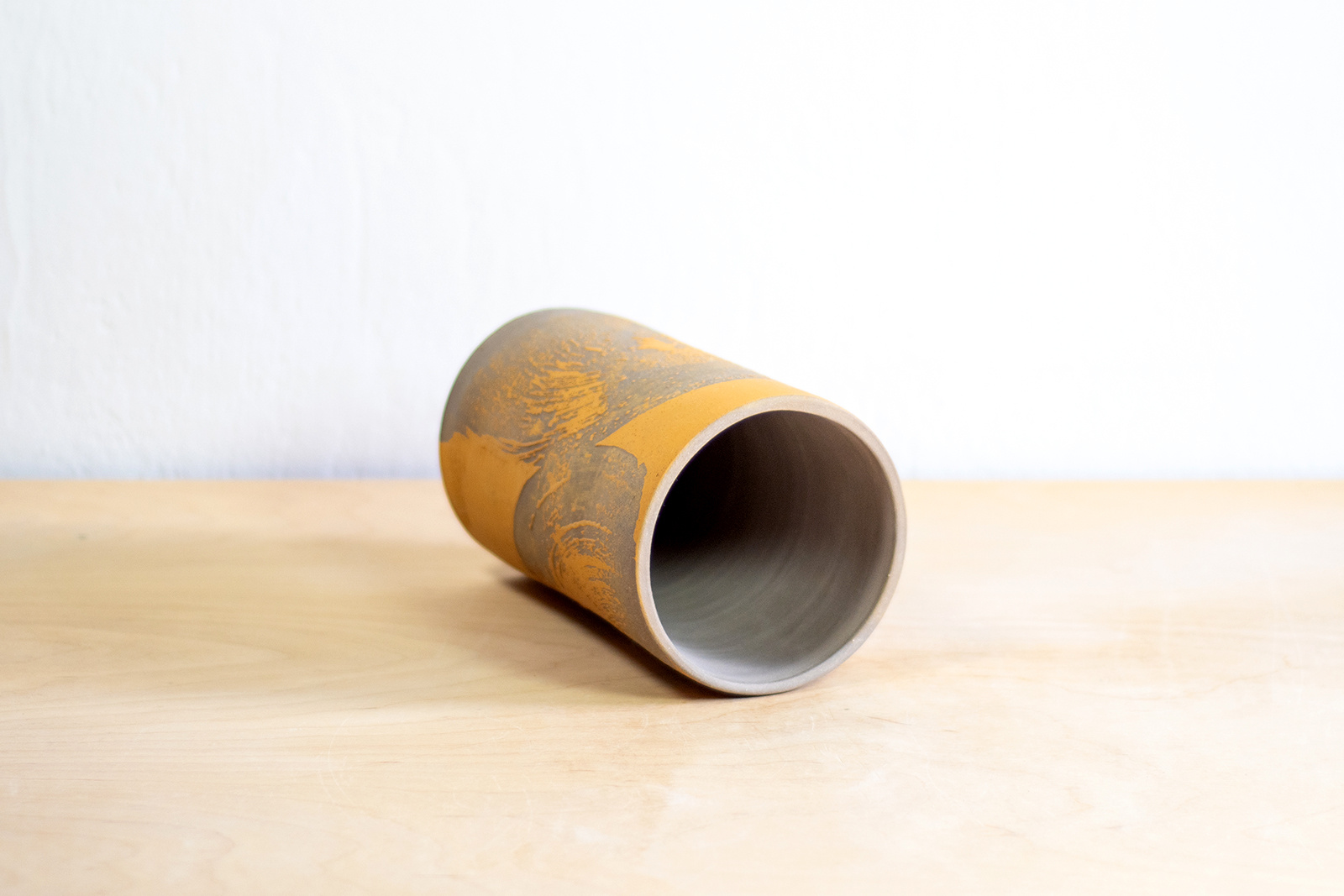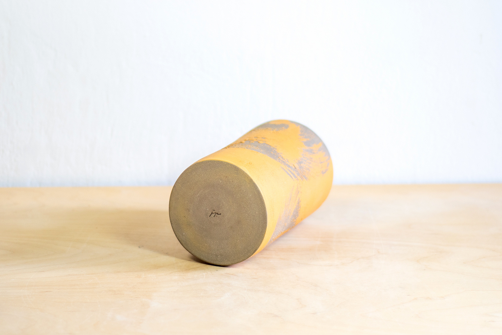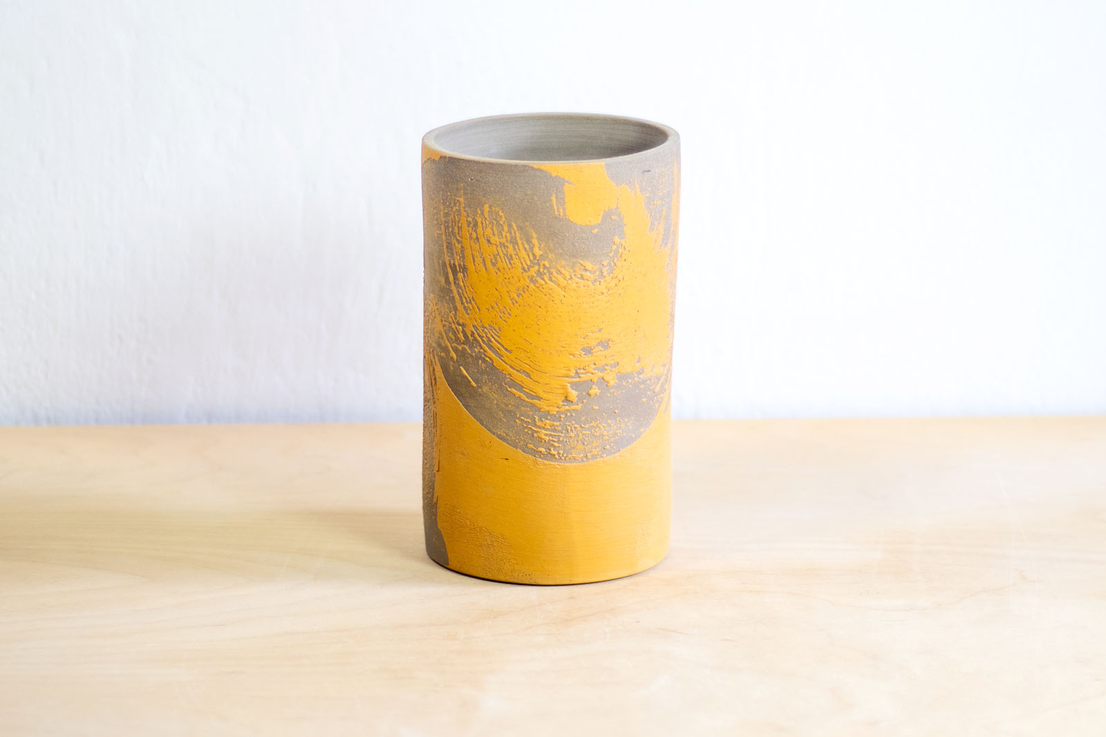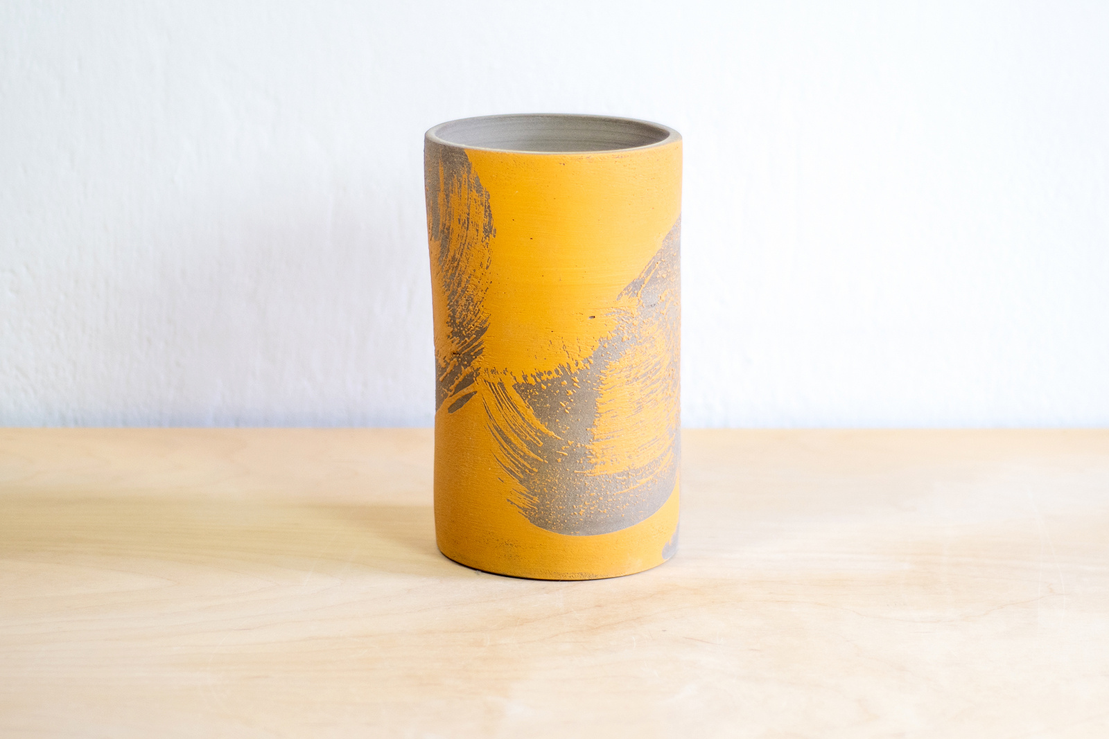Duży wazon w kształcie walca. Wytoczony na kole garncarskim z szarej gliny. Dekorowany delikatną fakturą w kolorze ochry, wykonaną szerokim pędzlem. Nieszkliwiony. Stemplowany logo autorki.