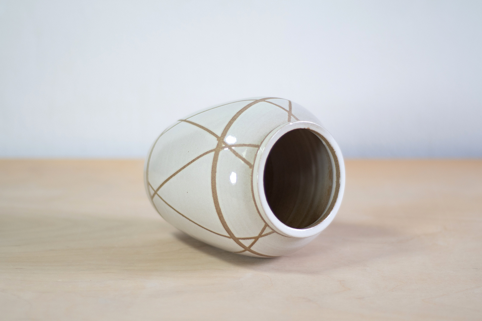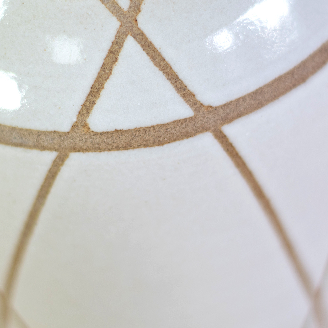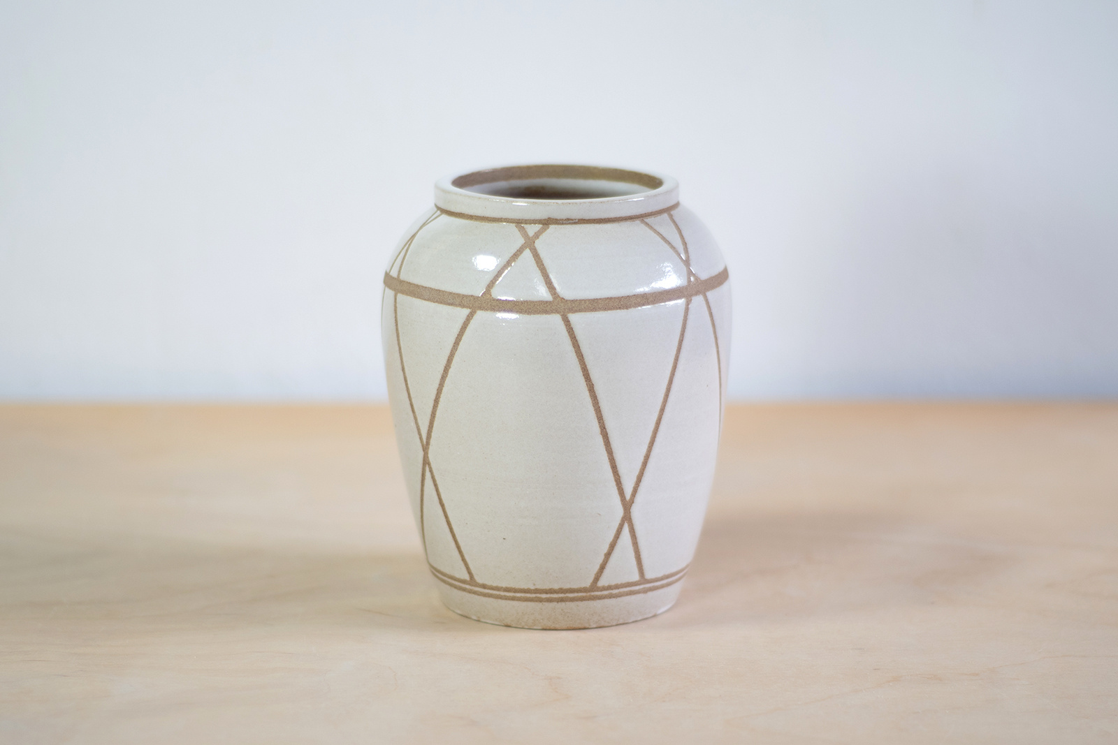 - Wazon o znacznych rozmiarach. Wytoczony na kole garncarskim z masy w kolorze orzechowym, dekorowany dodatkowo kreseczkami w geometrycznym układzie. Pokryty białym, błyszczącym szkliwem.