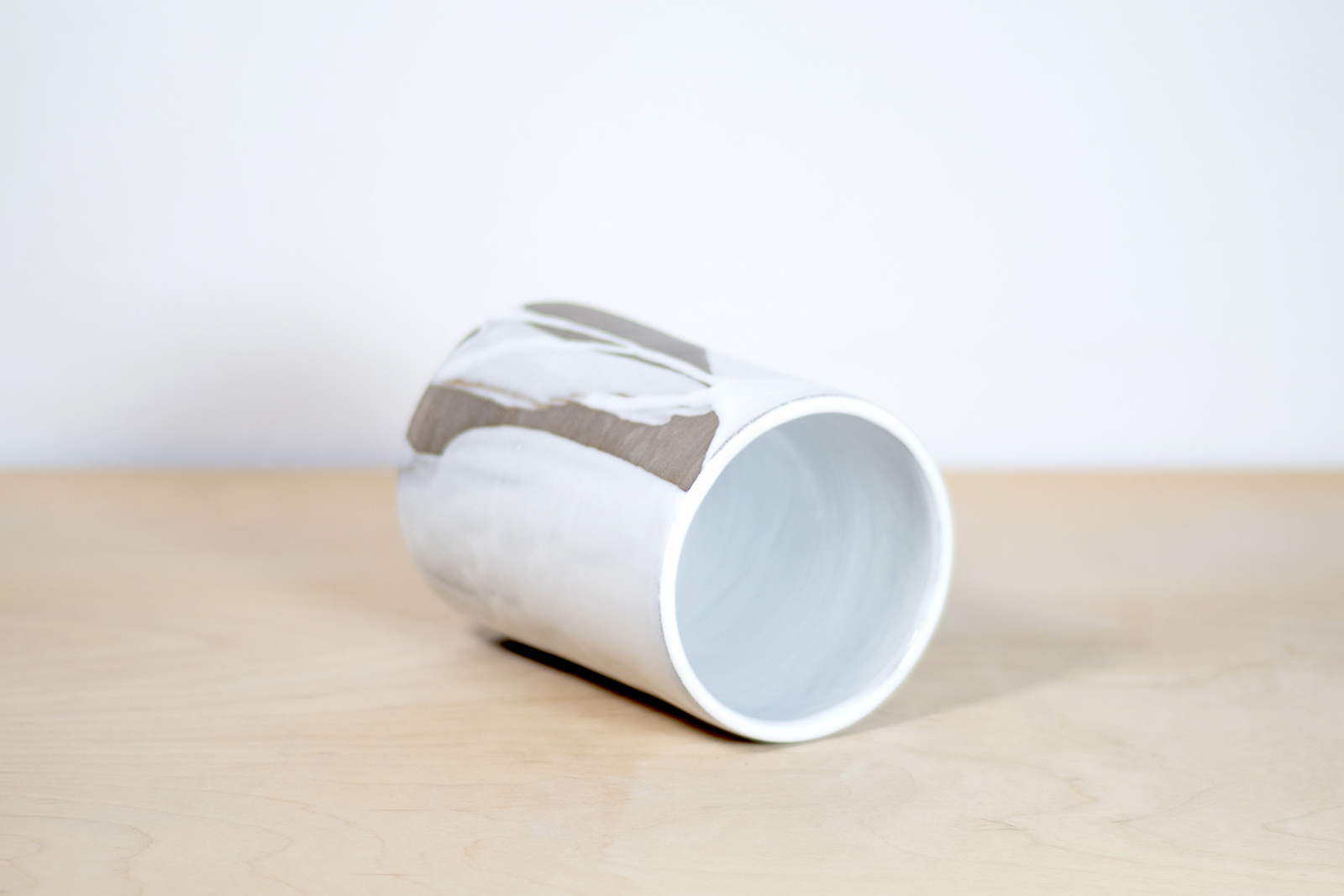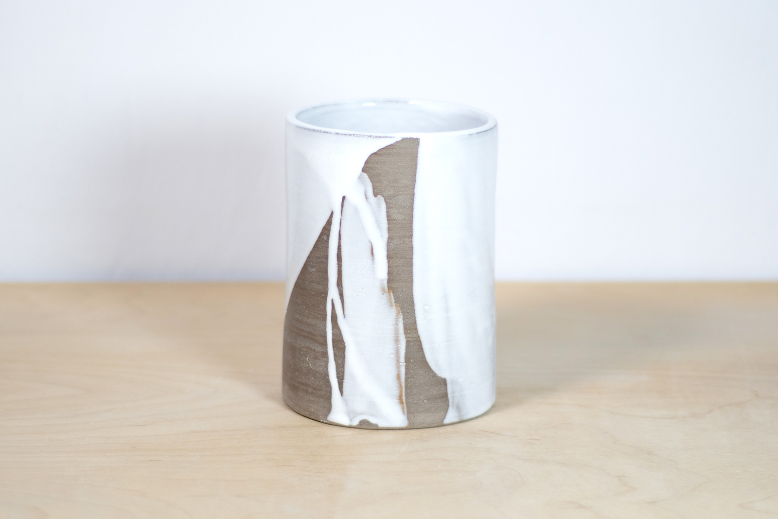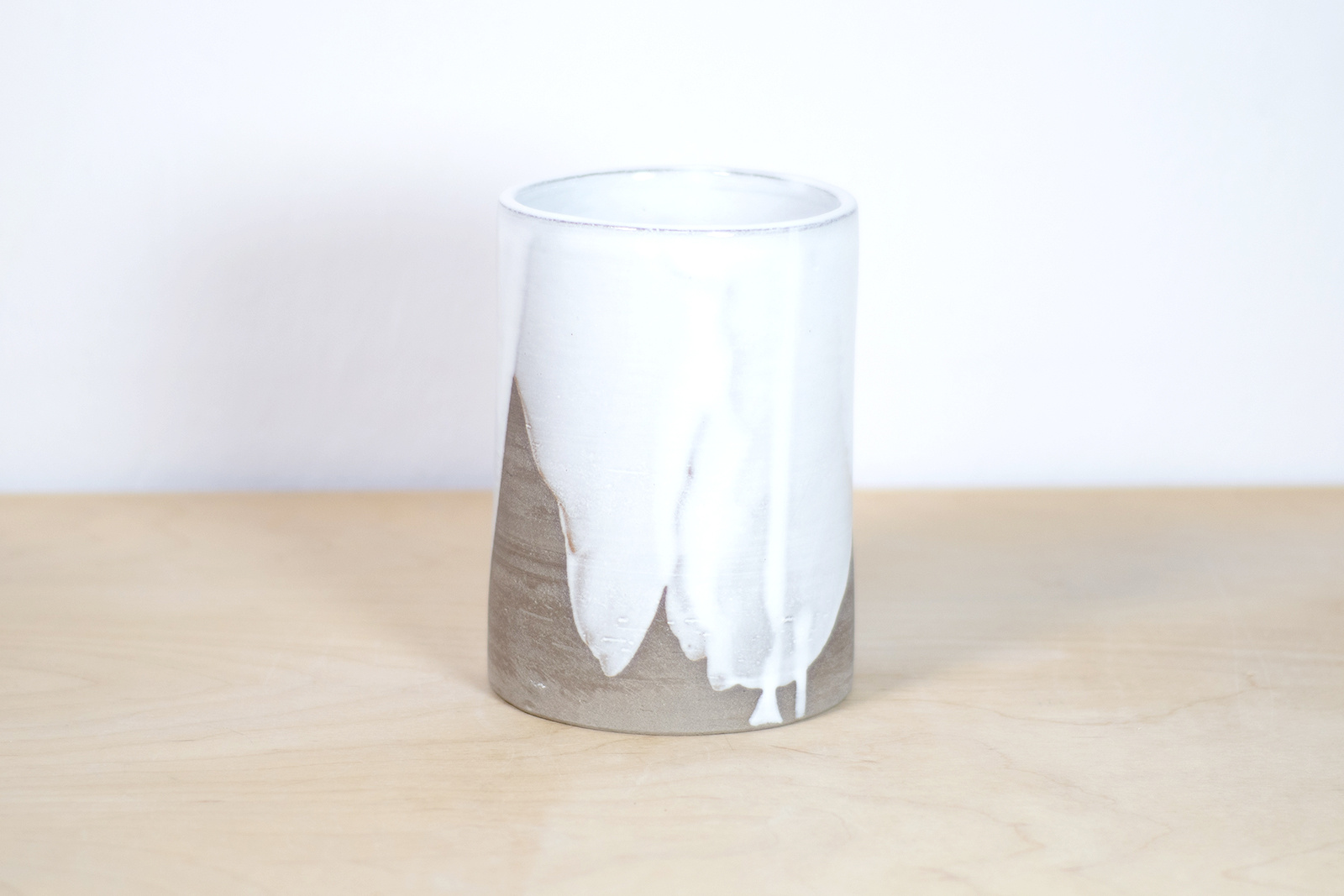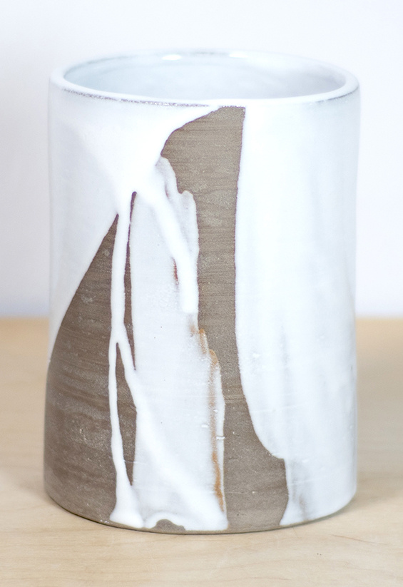 - Wazon w klasycznym kształcie walca. W całości wykonany na kole garncarskim z gliny w kolorze szarego betonu. Pokryty w malarski sposób szkliwem błyszczącym w kolorze białym.