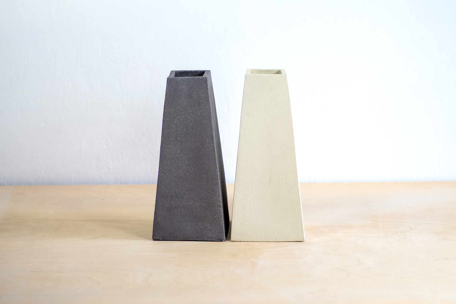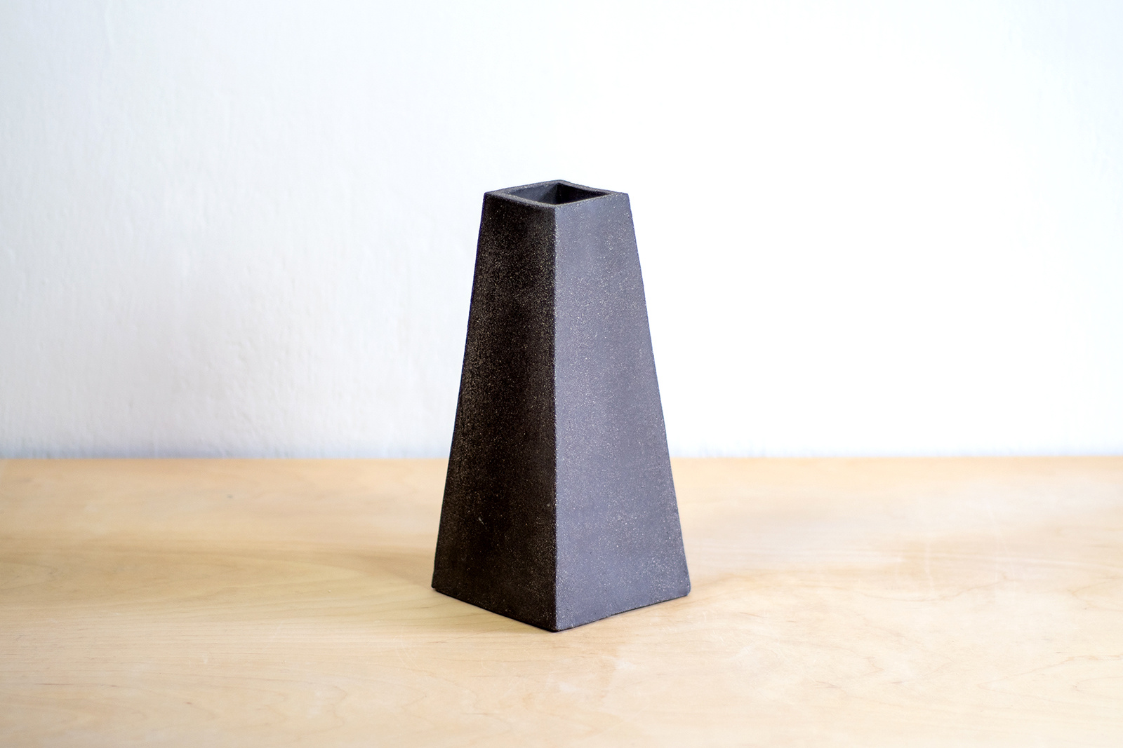 - Elegancki wazon w kształcie trapezu. Wykonany z ciemnej, brązowej gliny. Na zewnątrz, jeden bok proszkliwiony cienką warstwą transparentnego szkliwa.