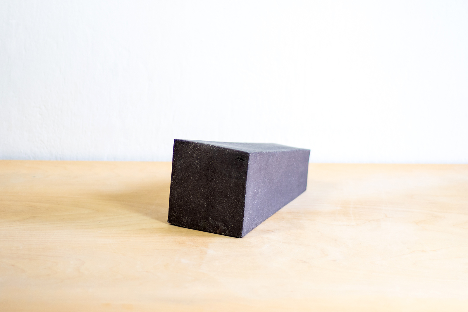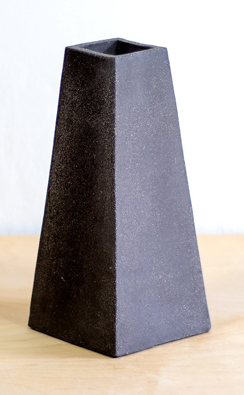 Wazon w kształcie trapezu wykonany ręcznie z płatów brązowej gliny. Na zewnątrz, jeden bok proszkliwiony cienką warstwą transparentnego szkliwa. Stemplowany logo autorki.