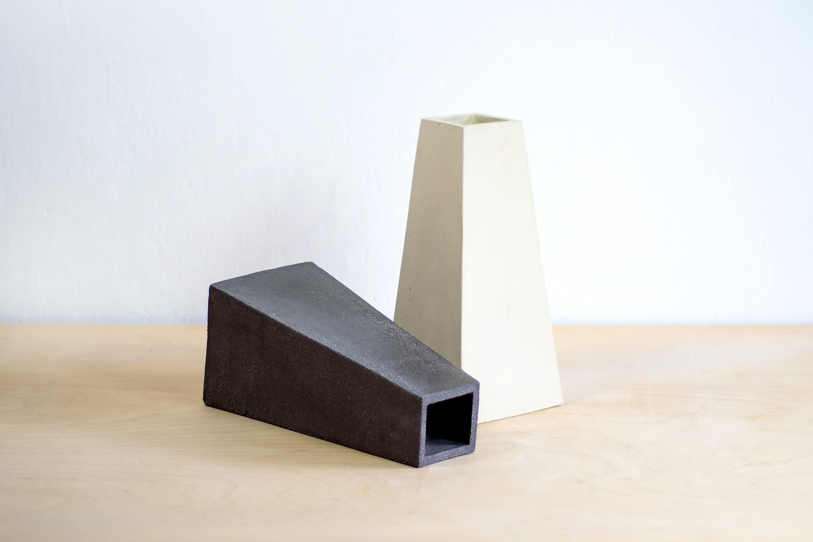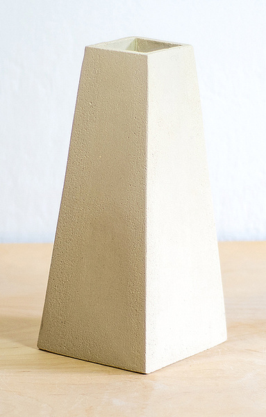 Wazon w kształcie trapezu wykonany ręcznie z płatów kremowej gliny. Na zewnątrz, jeden bok proszkliwiony cienką warstwą transparentnego szkliwa. Stemplowany logo autorki.