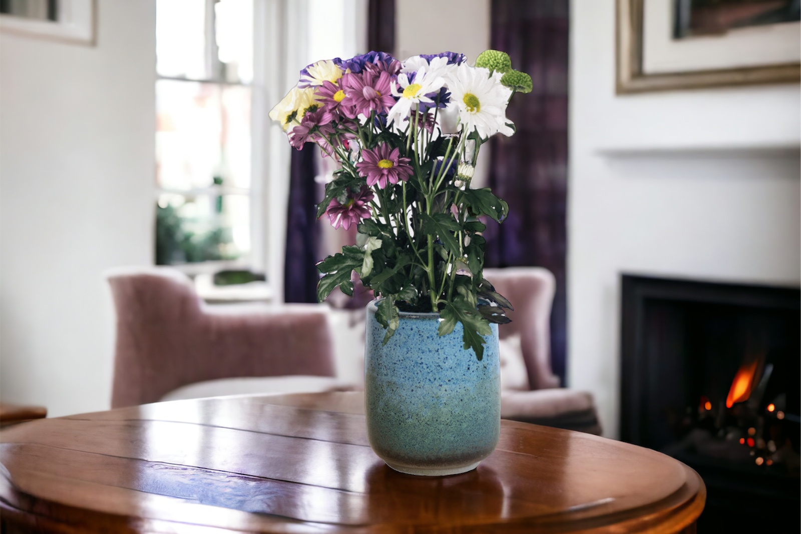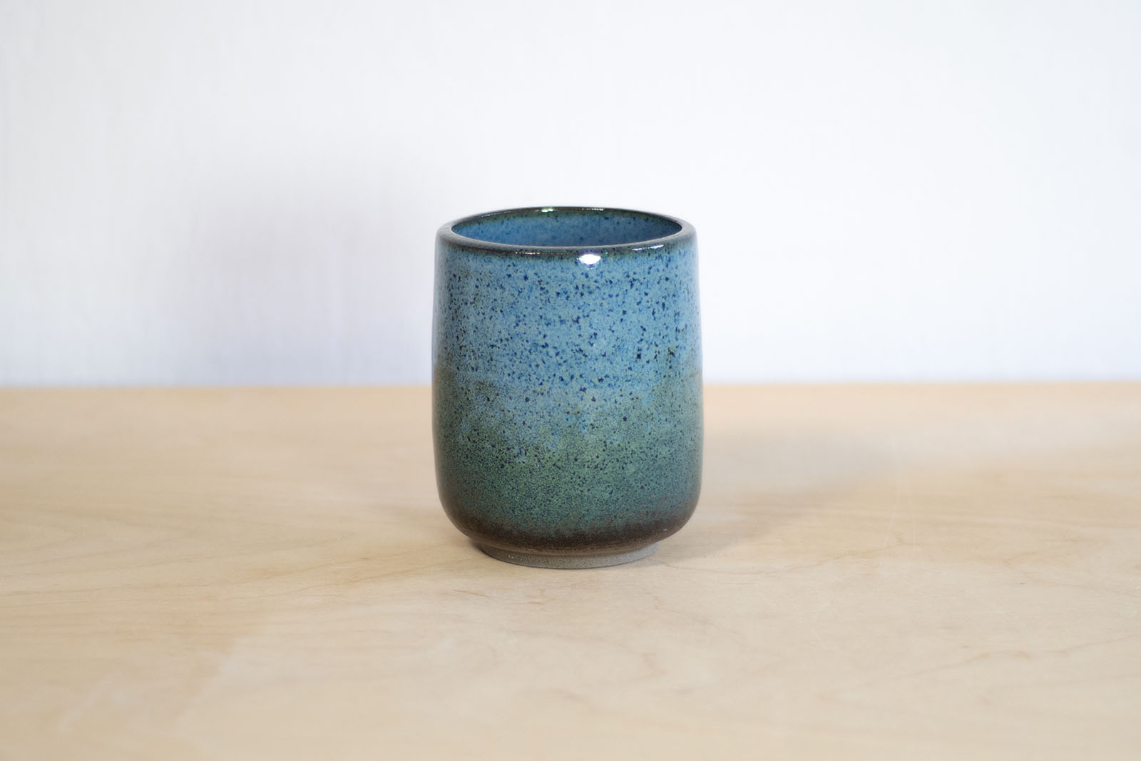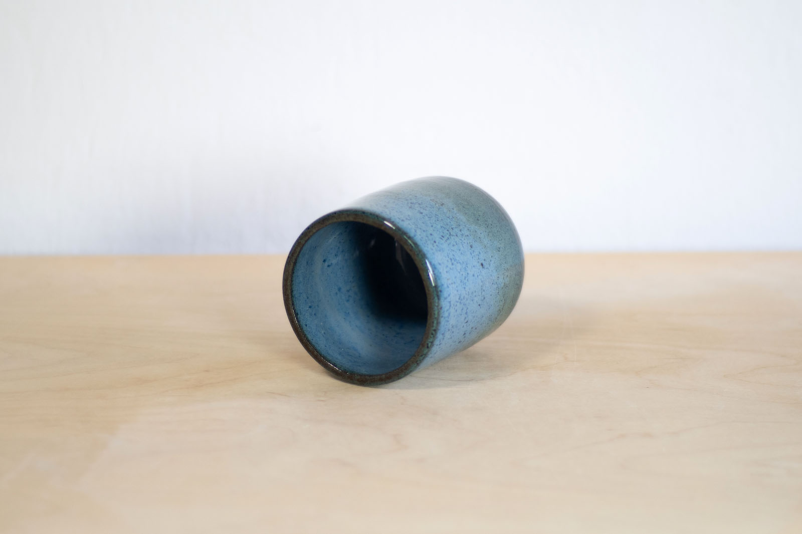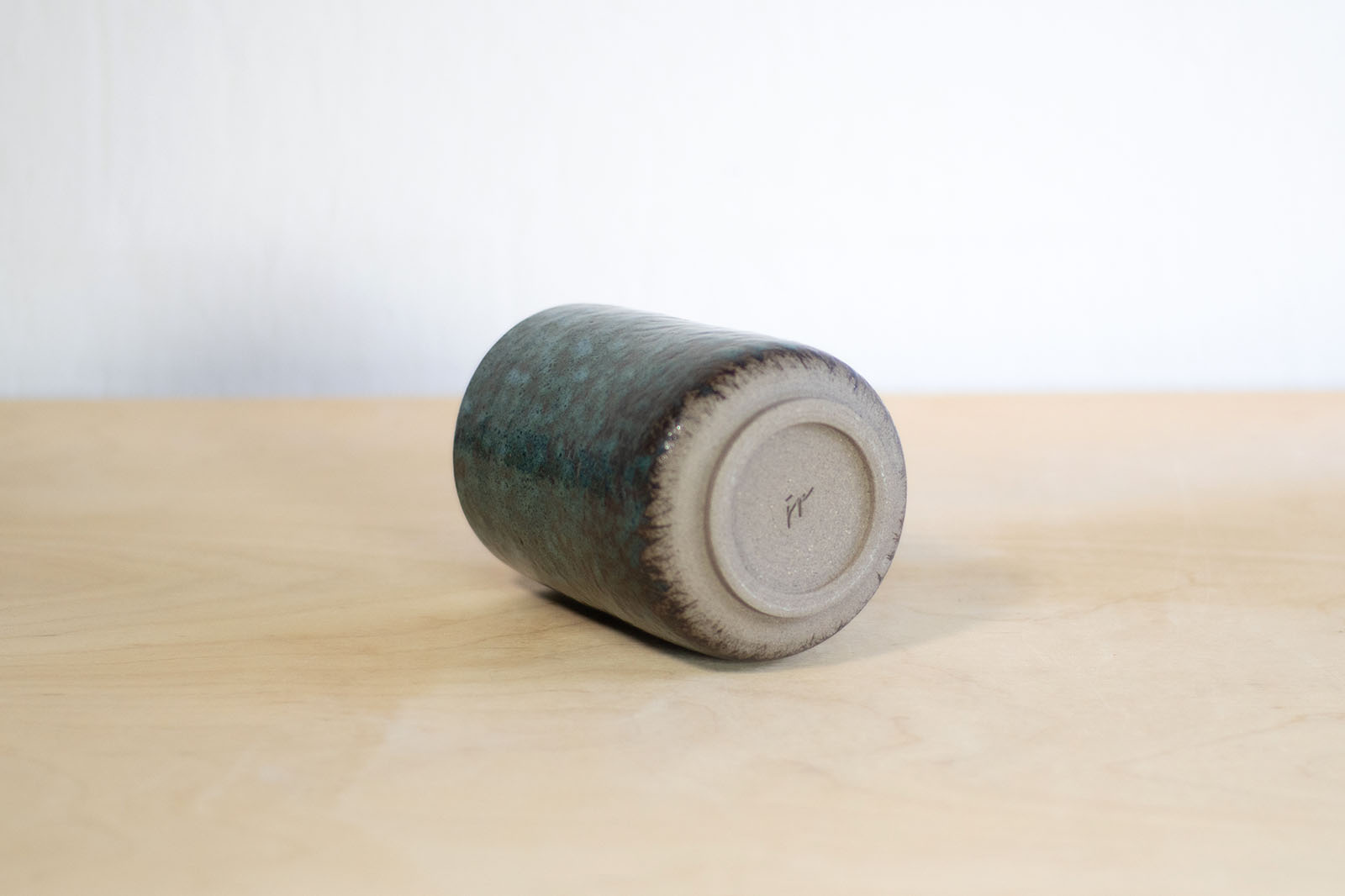 • Wazon o średniej wielkości, o prostej formie. Wykonany w całości z ciemnej masy na kole garncarskim. Pokryty błyszczącym, turkusowo-niebieskim szkliwem z brązowymi wtrąceniami.