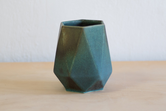 - Wazon inspirowany sztuką origami. Odlany z masy lejnej o jasnej, kremowej barwie. Pokryty w całości ciemnym, turkusowym, matowym szkliwem.
