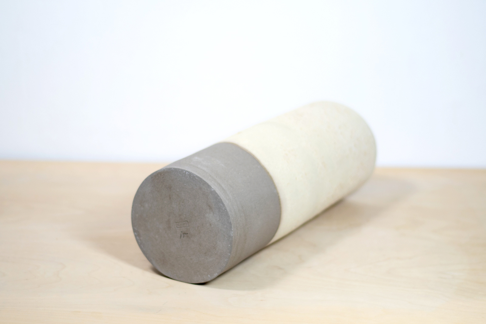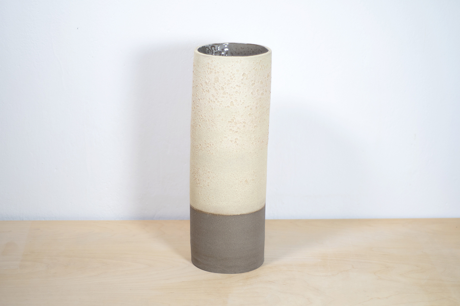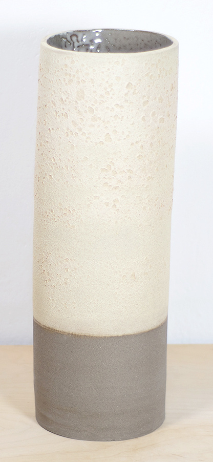 - Wysoki wazon w kształcie prostego walca o wysokości ponad 44 cm. Wykonany ręcznie z ciemnoszarej gliny. Zdobiony szkliwem z efektem jasnej lawy.