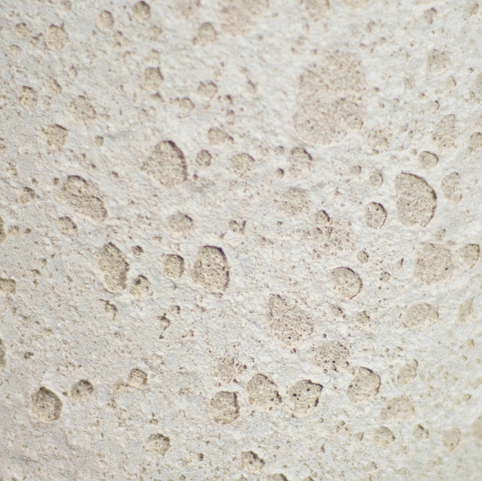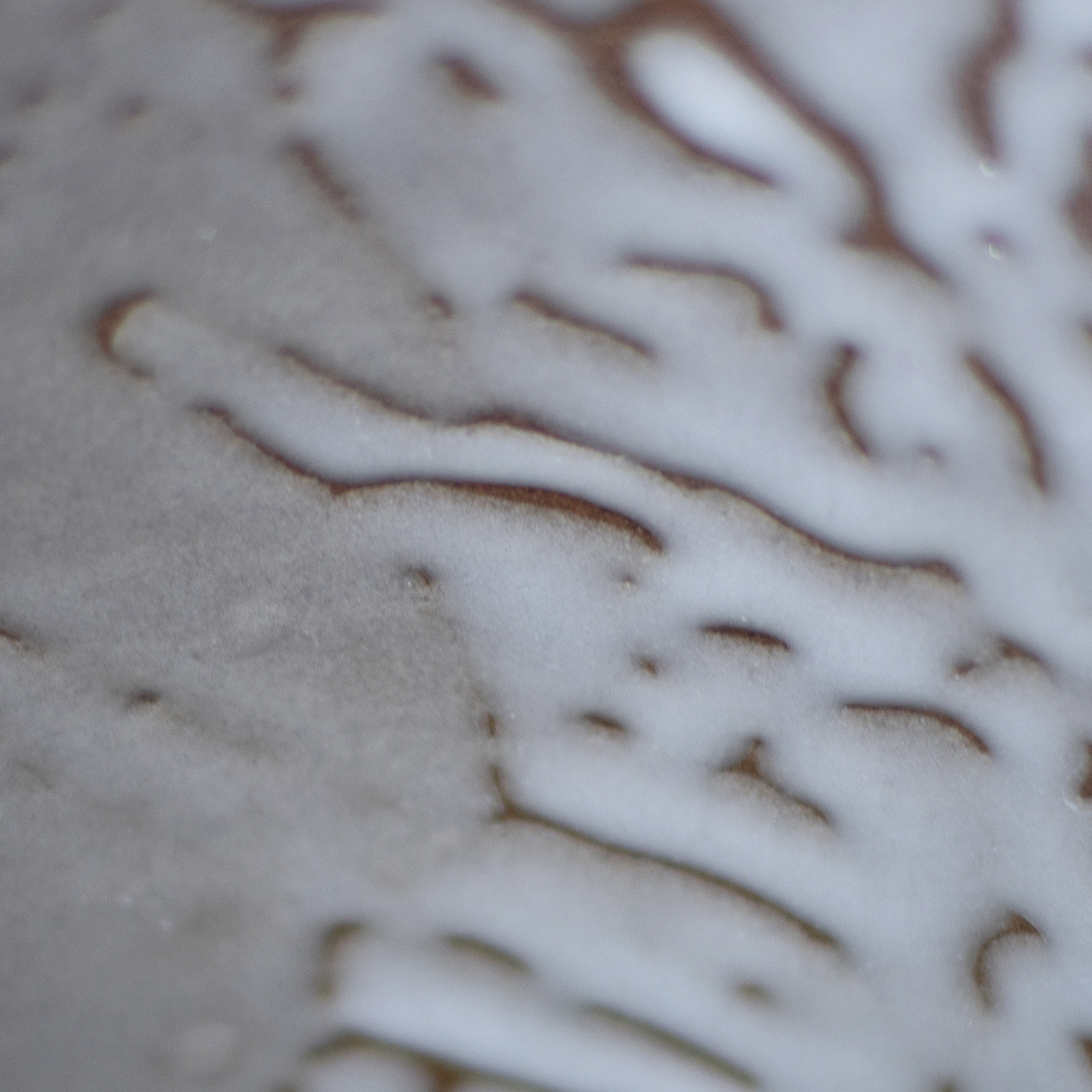 Wykonany ręcznie z gliny w kolorze ciemno-szarym. Na zewnątrz pokryty szkliwem z efektem jasnej lawy. Wewnątrz błyszczącym, transparentnym białym. Stemplowany logo autorki.