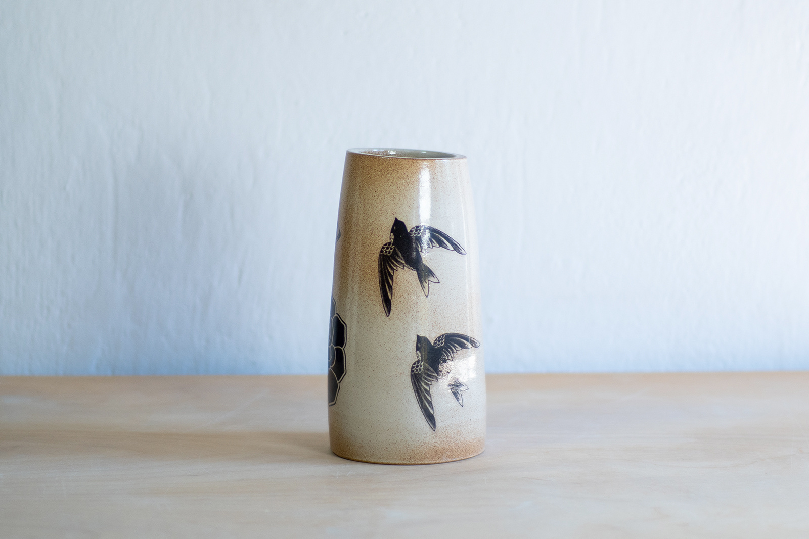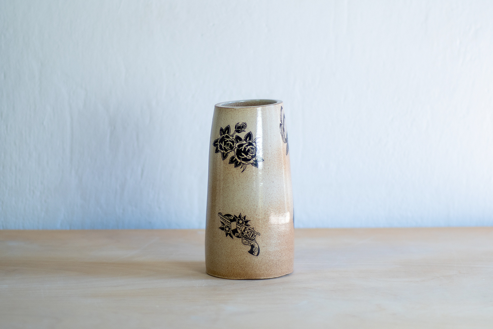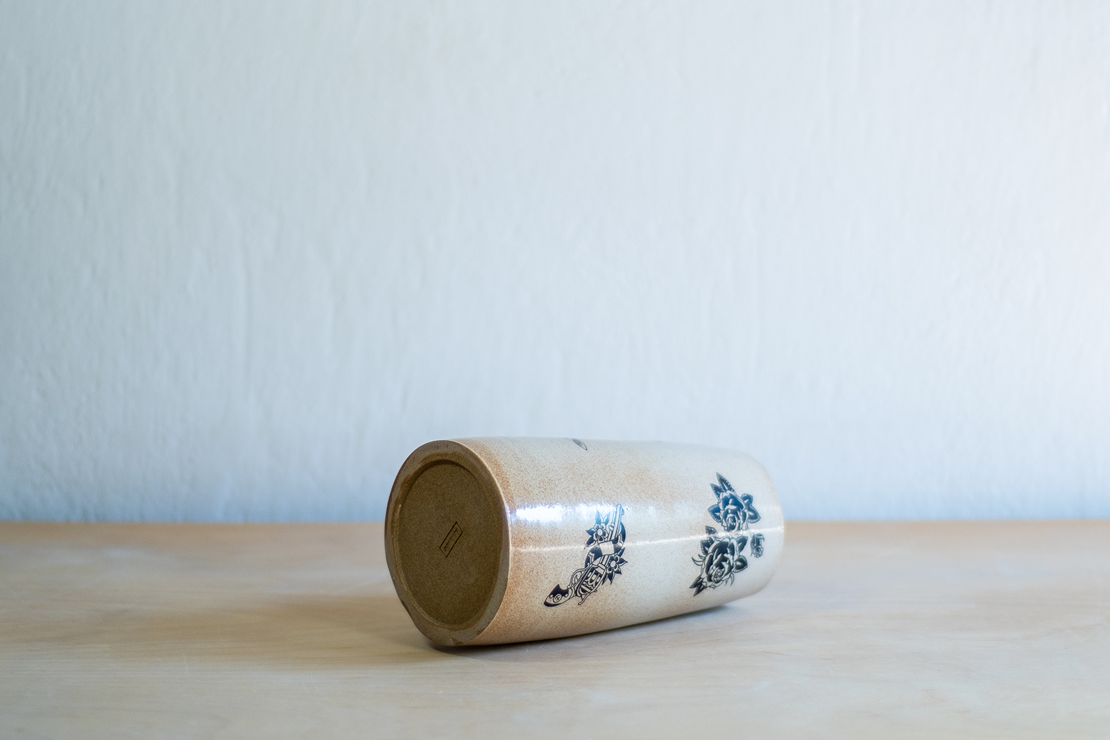 Duży wazon w kształcie zwężajacego się ku górze walca. Wykonany na kole garncarskim z orzechowej masy. Pokryty białym, błyszczącym szkliwem i dekorowany kalkami ceramicznymi w kształcie tatuaży.