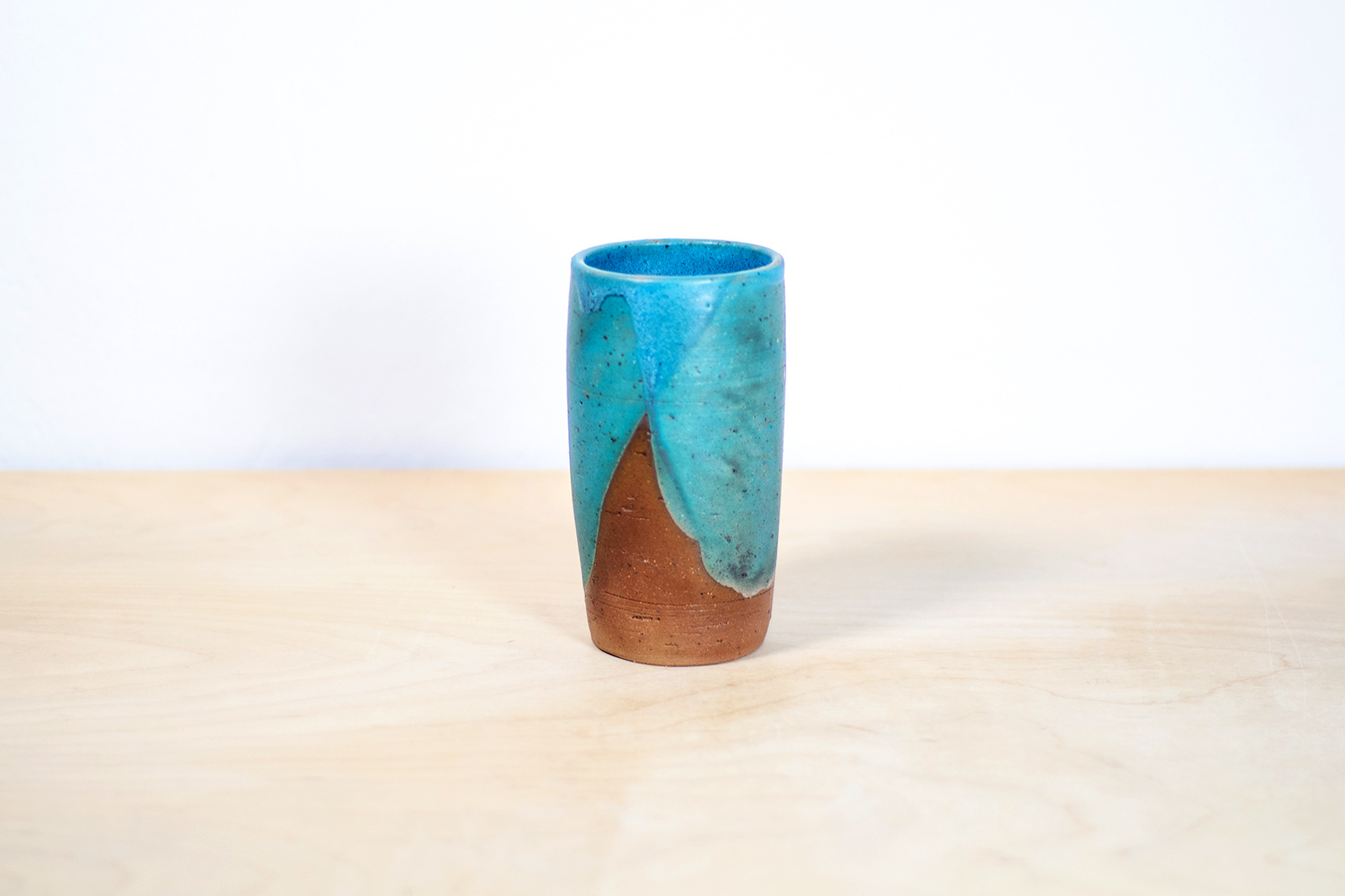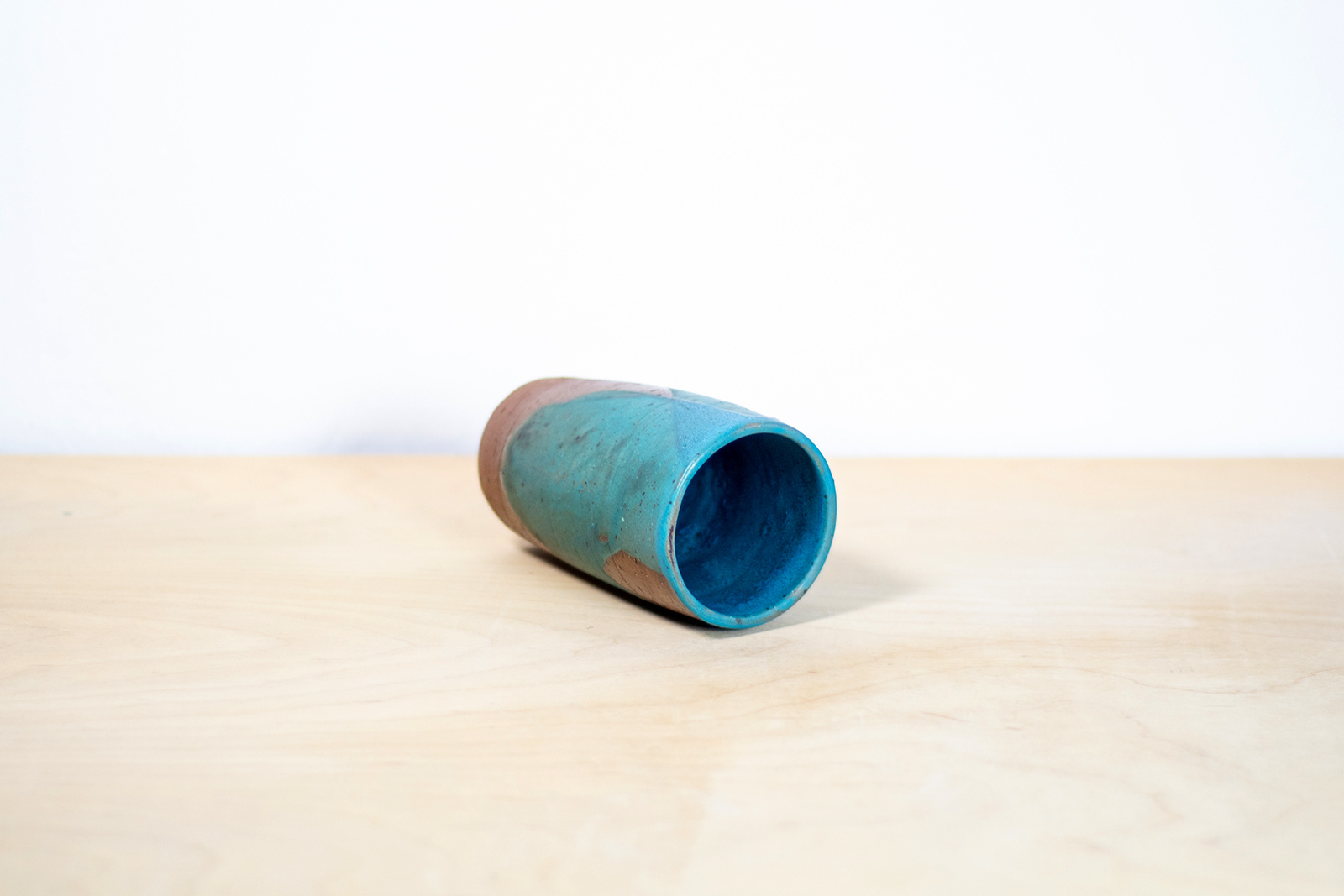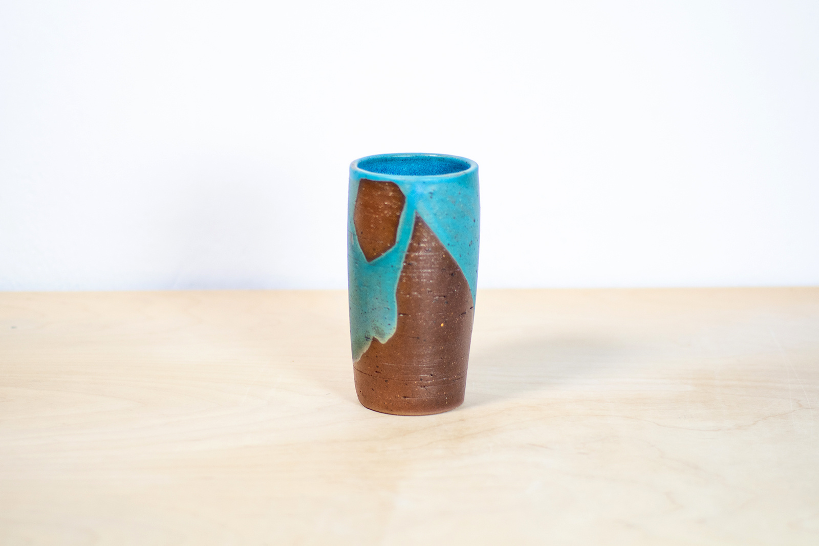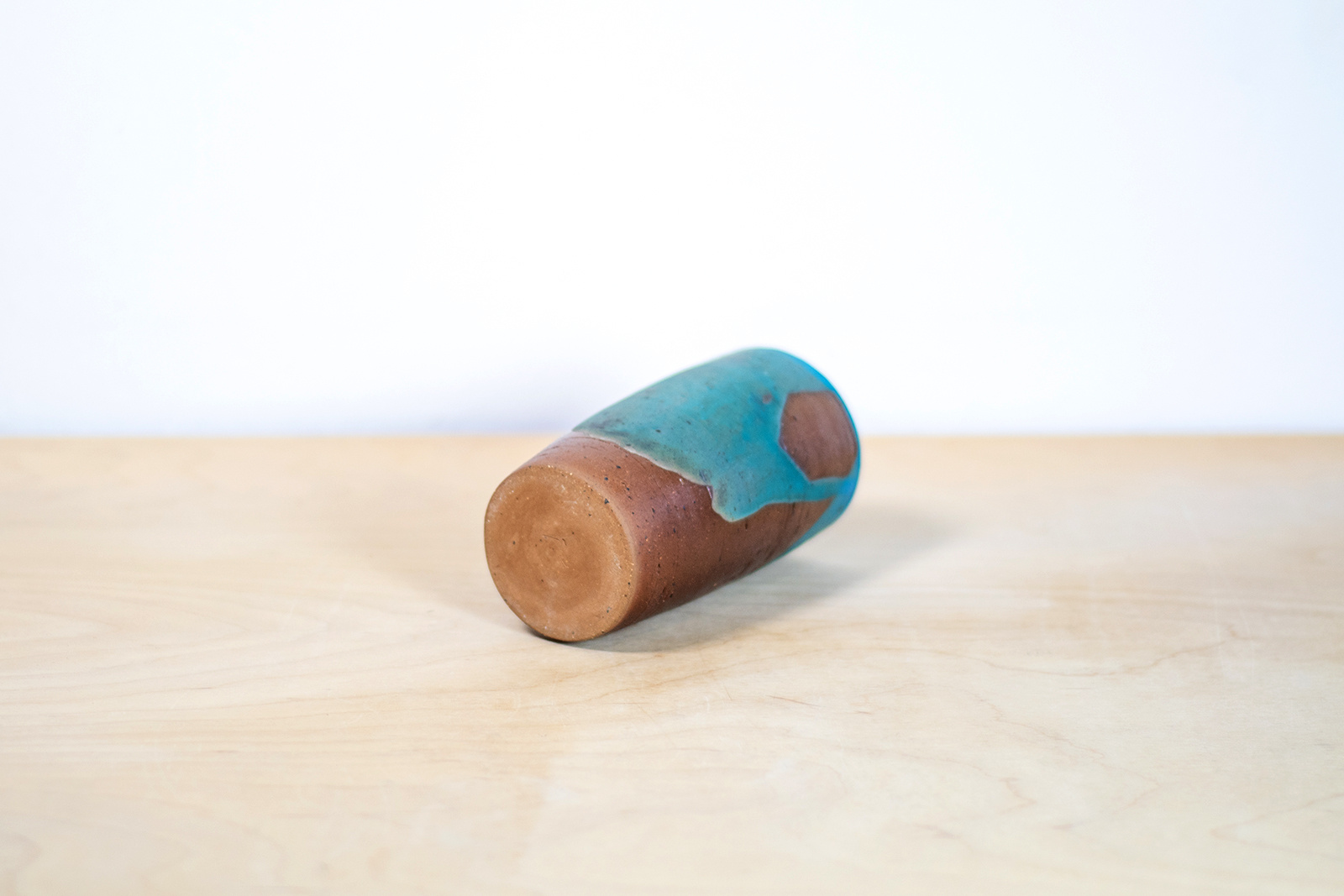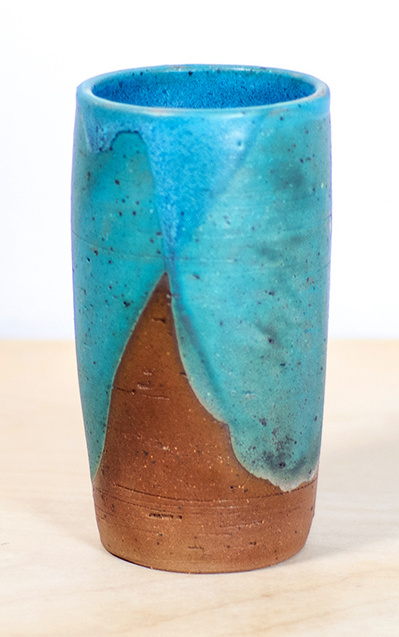 - Wazonik na niewielki bukiecik. Wykonany na kole garncarskim z bordowej gliny. Powierzchnia dekorowana malarsko, turkusowym matowym szkliwem.
