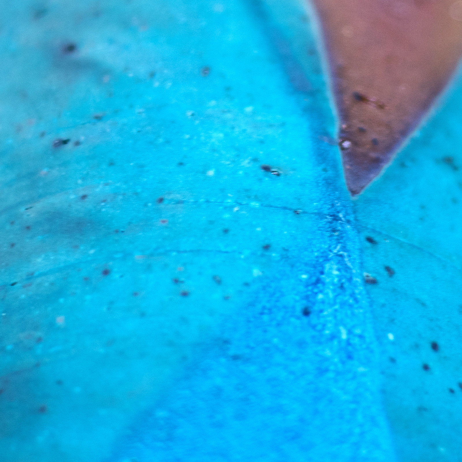 Wytoczony na kole garncarskim. Wykonany z gliny w kolorze bordowym. malarsko, turkusowym matowym szkliwem. Stemplowany logo autorki.