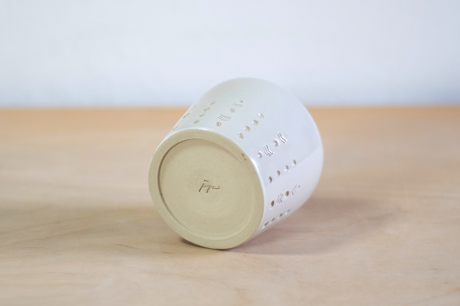 Wytoczony na kole garncarskim z masy w kolorze kremowym, dekorowany ręcznie tłoczonym deseniem. Pokryty białym, błyszczącym szkliwem. Idealny na stolik kuchenny.