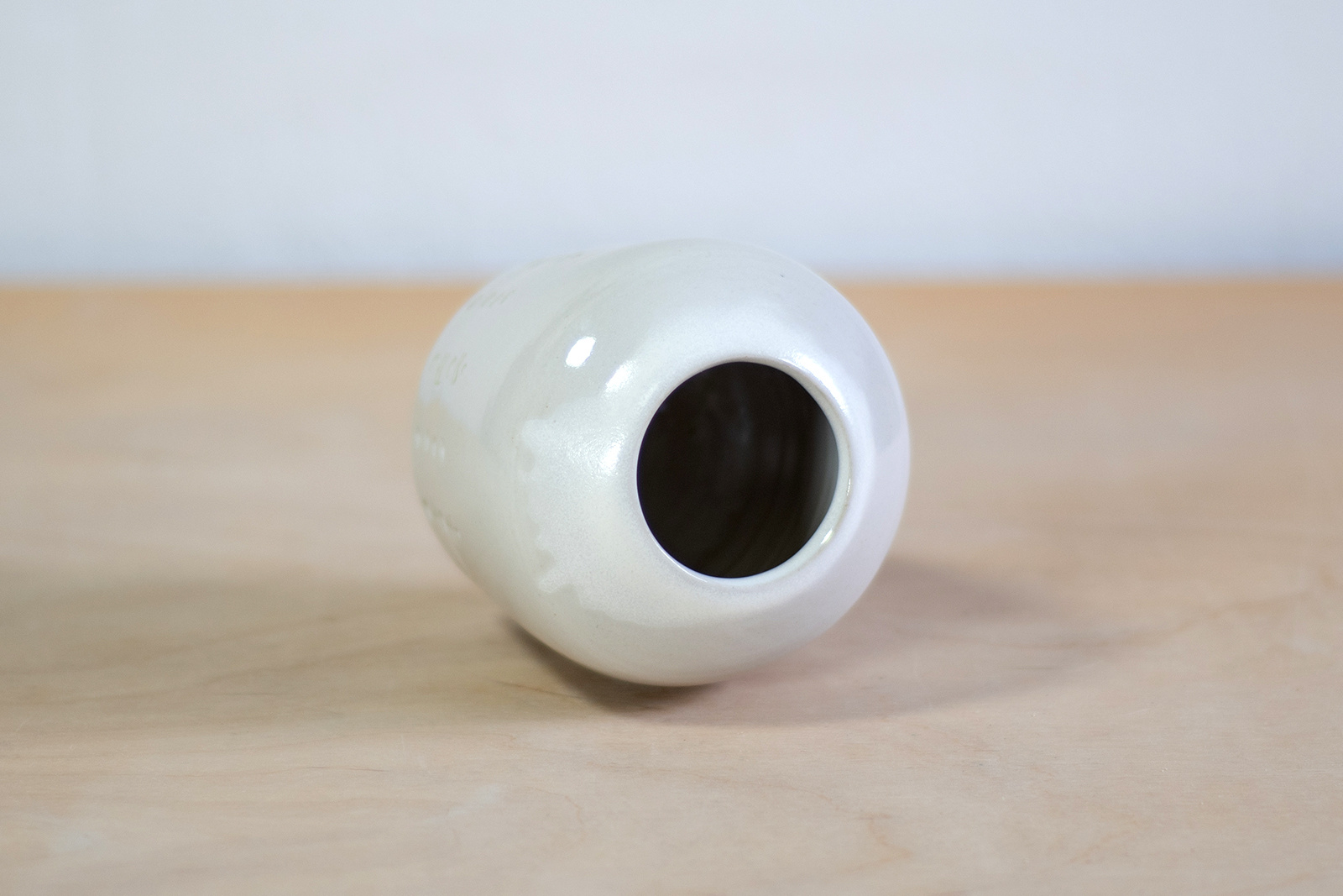 - Biały wazonik o niewielkich rozmiarach. Wytoczony na kole garncarskim z masy w kolorze kremowym, dekorowany dodatkowo tłoczonym deseniem. Pokryty białym, błyszczącym szkliwem. Idealny na stolik kuchenny.