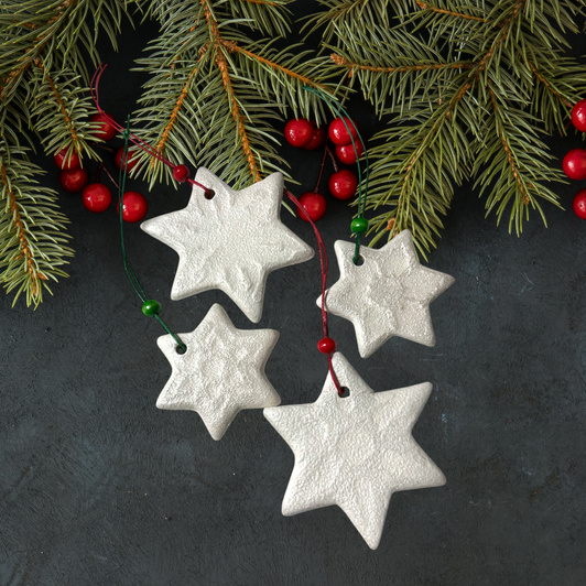 Ozdoby formowane oraz dekorowane ręcznie. Wypukłe gwiazdki ozdobione zostały białym, matowym szkliwem. Każda zawieszka została wyposażona również w zawieszkę oraz dekoracyjny koralik.