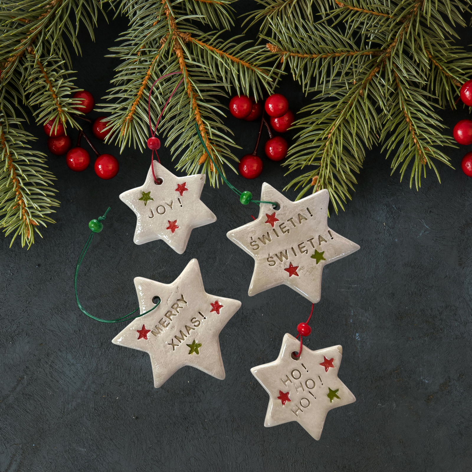 Ozdoby formowane oraz dekorowane ręcznie. Wszystkie gwiazdki ozdobione zostały świątecznymi napisami oraz kolorowymi gwiazdkami. Dodatkowo pokryte transparentnym, błyszczącym szkliwem. Każda zawieszka została wyposażona również w zawieszkę oraz dekoracyjny koralik.