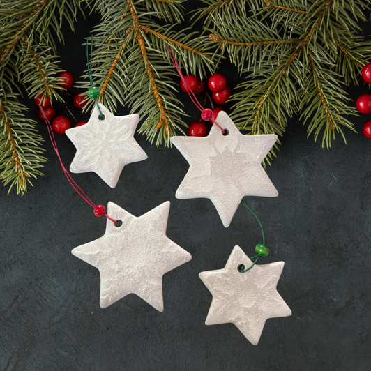 Ozdoby formowane oraz dekorowane ręcznie. Wypukłe gwiazdki ozdobione zostały białym, matowym szkliwem. Każda zawieszka została wyposażona również w zawieszkę oraz dekoracyjny koralik.