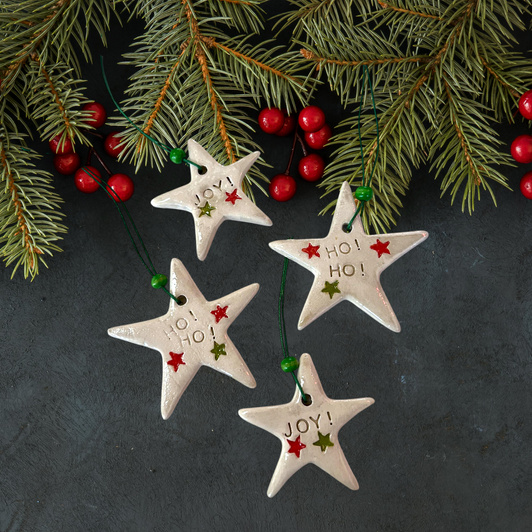 Ozdoby formowane oraz dekorowane ręcznie. Wszystkie gwiazdki ozdobione zostały świątecznymi napisami oraz kolorowymi gwiazdkami. Dodatkowo pokryte transparentnym, błyszczącym szkliwem. Każda zawieszka została wyposażona również w zawieszkę oraz dekoracyjny koralik.