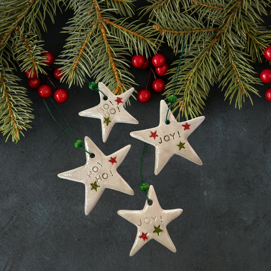 Ozdoby formowane oraz dekorowane ręcznie. Wszystkie gwiazdki ozdobione zostały świątecznymi napisami oraz kolorowymi gwiazdkami. Dodatkowo pokryte transparentnym, błyszczącym szkliwem. Każda zawieszka została wyposażona również w zawieszkę oraz dekoracyjny koralik.