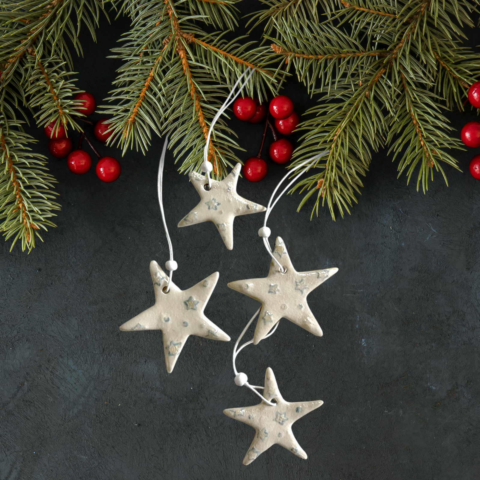 - Elegancki zestaw ceramicznych dekoracji świątecznych. Składa się z 4 zawieszek, 2 dużych i 2 małych. Wykonane ręcznie z białej masy ceramicznej. Dekorowane wypukłymi gwiazdkami z obwódką w kolorze błękitnym. Pokryte transparentnym, błyszczącym szkliwem.
