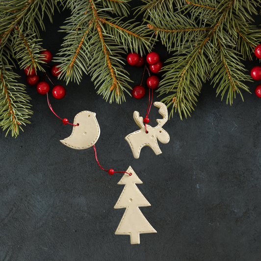 - Elegancki zestaw ceramicznych dekoracji świątecznych. Składa się z 3 zawieszek w kształcie choinki, ptaszka oraz reniferka. Wykonane ręcznie z białej masy ceramicznej i dekorowane ozdobnym szwem. Pokryte transparentnym, błyszczącym szkliwem.