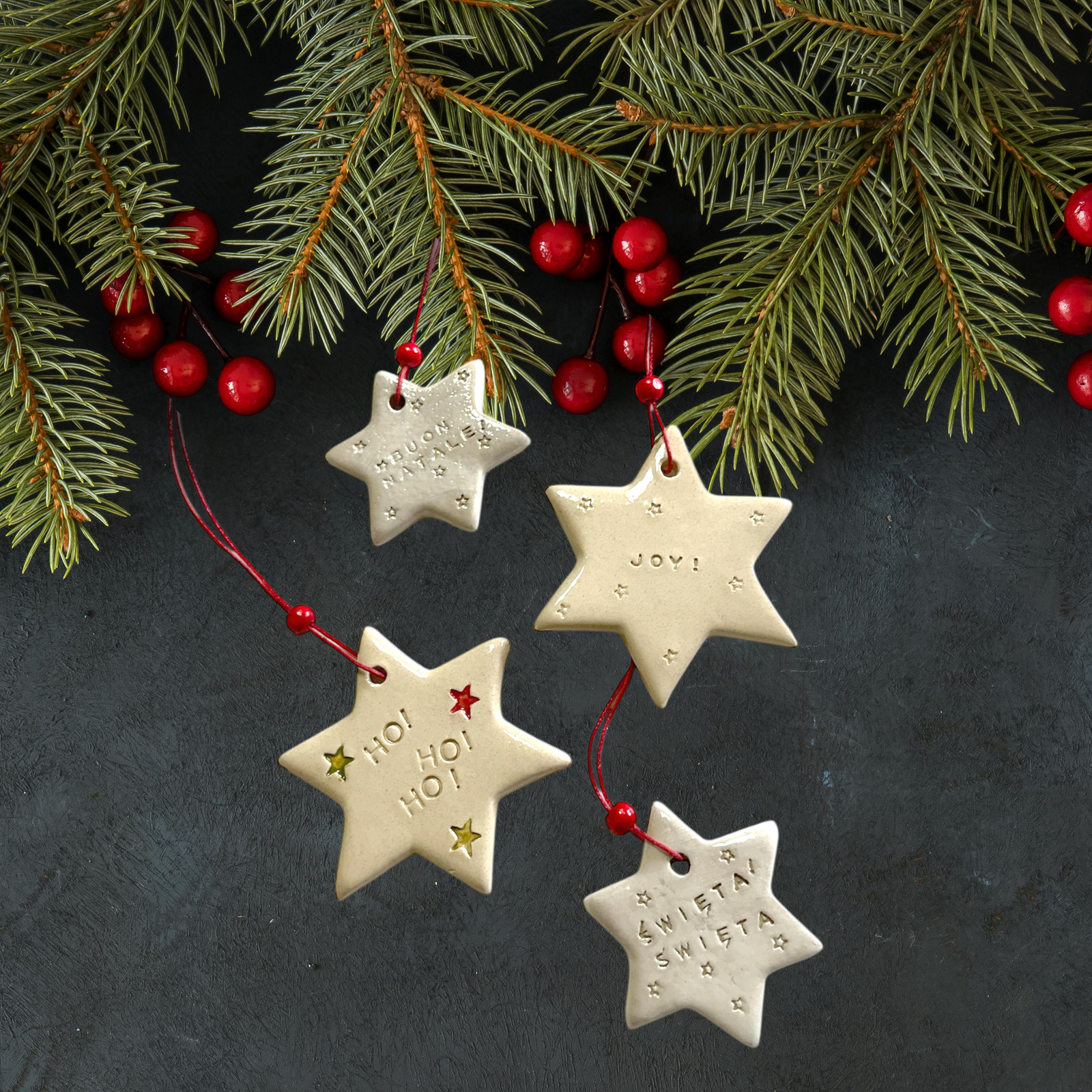 - Elegancki zestaw ceramicznych dekoracji świątecznych. Składa się z 4 zawieszek w kształcie gwiazdek. Wykonane ręcznie z białej masy ceramicznej, dekorowane kolorowymi angobami oraz napisami. Pokryte transparentnym, błyszczącym szkliwem.