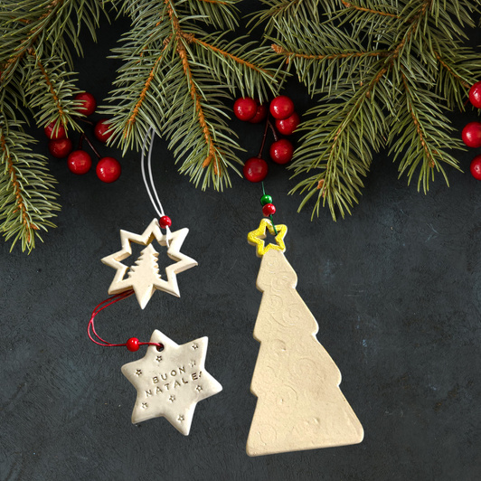 Ozdoby formowane ręcznie w kształcie choinki oraz gwiazdek. Wykonane ręcznie z białej masy ceramicznej, dekorowane kolorowymi angobami. Pokryte błyszczącym szkliwem. Każda zawieszka została wyposażona również w zawieszkę oraz dekoracyjny koralik.