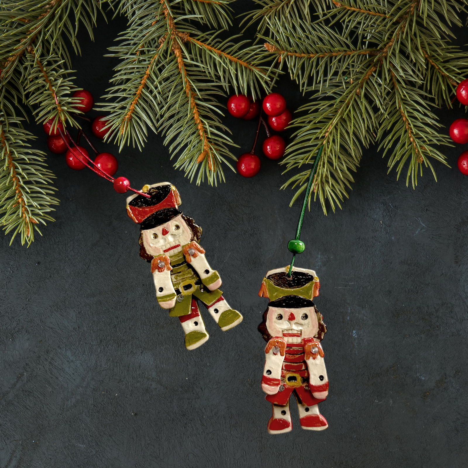 - Elegancki zestaw ceramicznych dekoracji świątecznych. Składa się z 2 zawieszek w kształcie dziadków do orzechów. Wykonane ręcznie z białej masy ceramicznej, dekorowane kolorowymi angobami. Pokryte błyszczącym szkliwem.