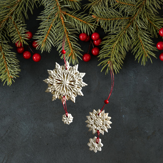 - Elegancki zestaw ceramicznych dekoracji świątecznych. Składa się z 2 podwójnych zawieszek w koronkowych kształcie gwiazdek. Wykonane ręcznie z białej masy ceramicznej, dekorowane białym, błyszczącym szkliwem.