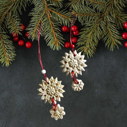 - Elegancki zestaw ceramicznych dekoracji świątecznych. Składa się z 2 podwójnych zawieszek w koronkowych kształcie gwiazdek. Wykonane ręcznie z białej masy ceramicznej, dekorowane białym, błyszczącym szkliwem.